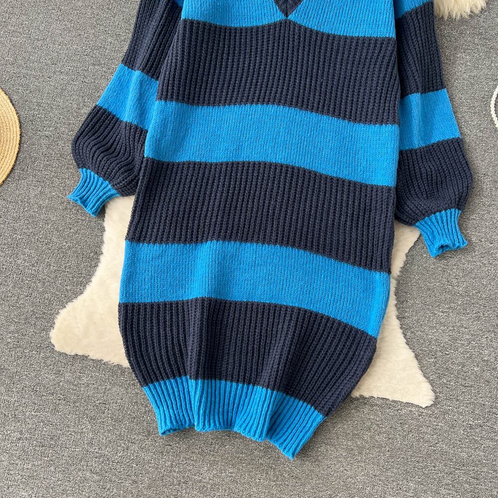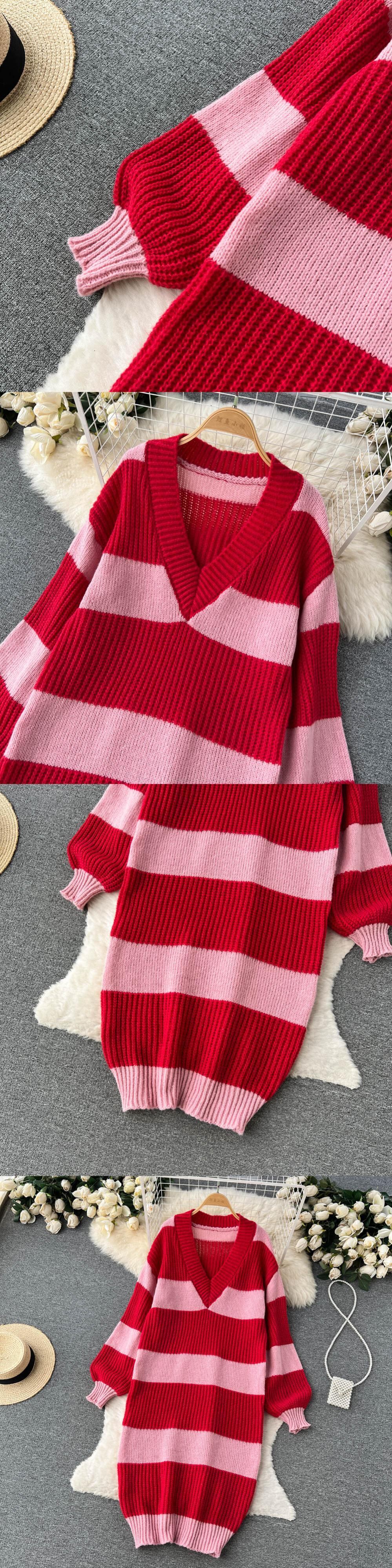 2022 ストライプカラーブロッキング特大 V ネック秋冬女性ロングセータードレス オータム 秋物 ウィンター 冬物 Vネック Abe44094164850
