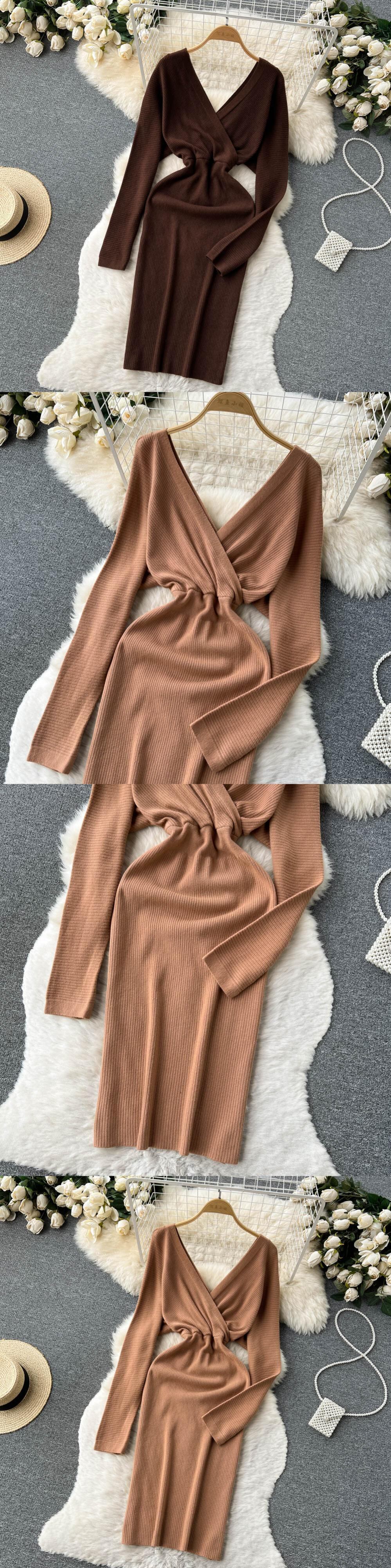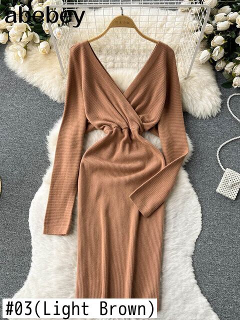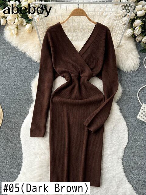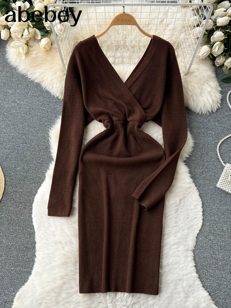 2022 秋セクシーなニットドレス長袖気質ニットシース V ネック固体女性パーティーセーターロングドレス オータム 秋物 Vネック ソリッドカラー Abe81333463163