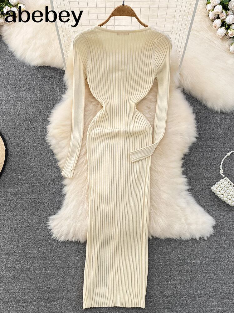 女性秋ニットドレス V ネックセクシーなスリム弾性特大の基本的なボディコンセータードレス冬のニット暖かいロングドレス エラスティック 伸縮 オータム 秋物 ウィンター 冬物 Vネック Abe87127367149