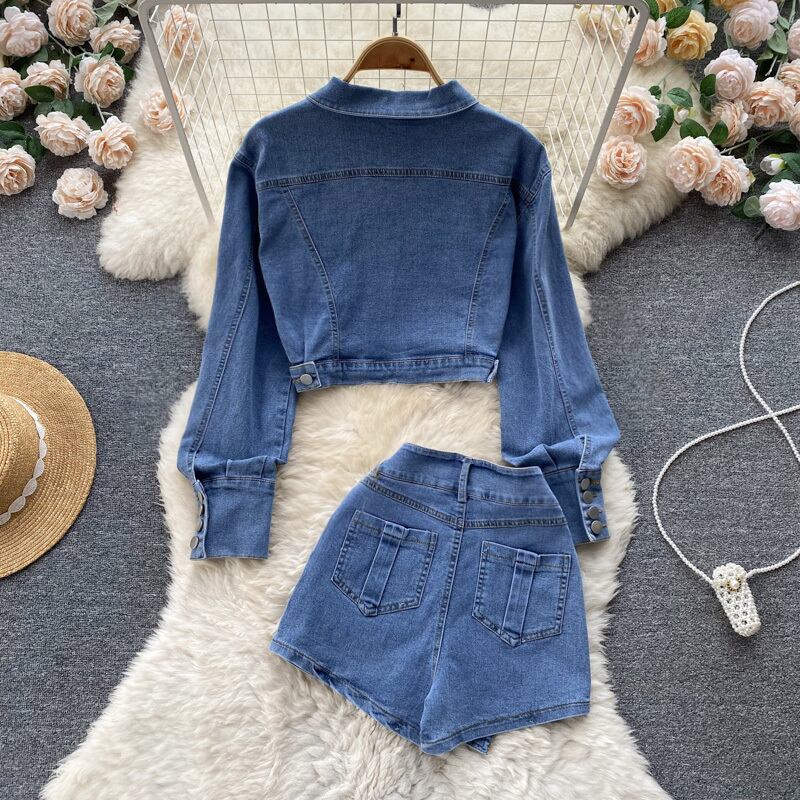 シックなデニムツーピースセットレディース衣装女性セット春 & 秋フルシャツクロップトップス + ミニショーツ無料 スプリング 春物 オータム 秋物 ブルマー Abe76953985765