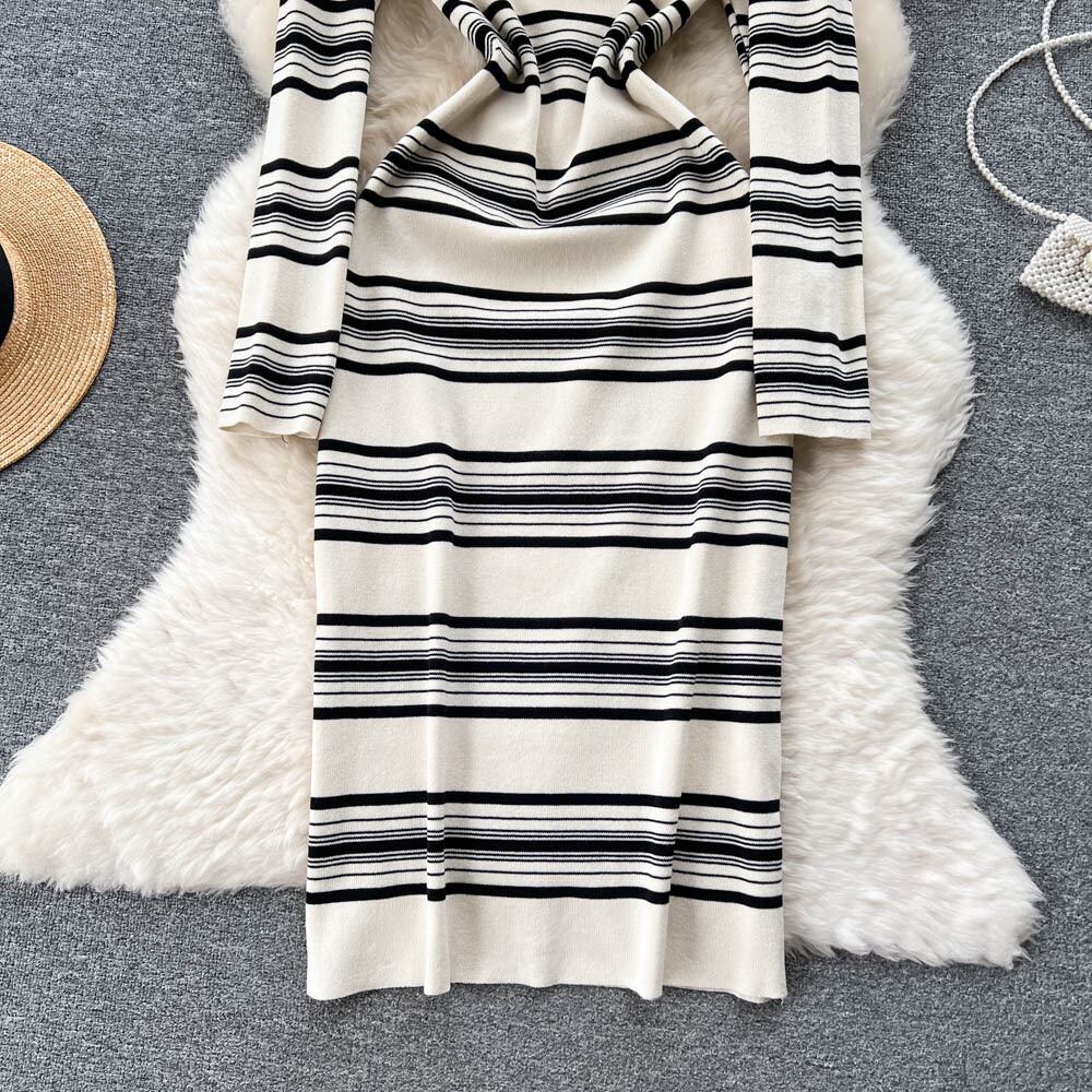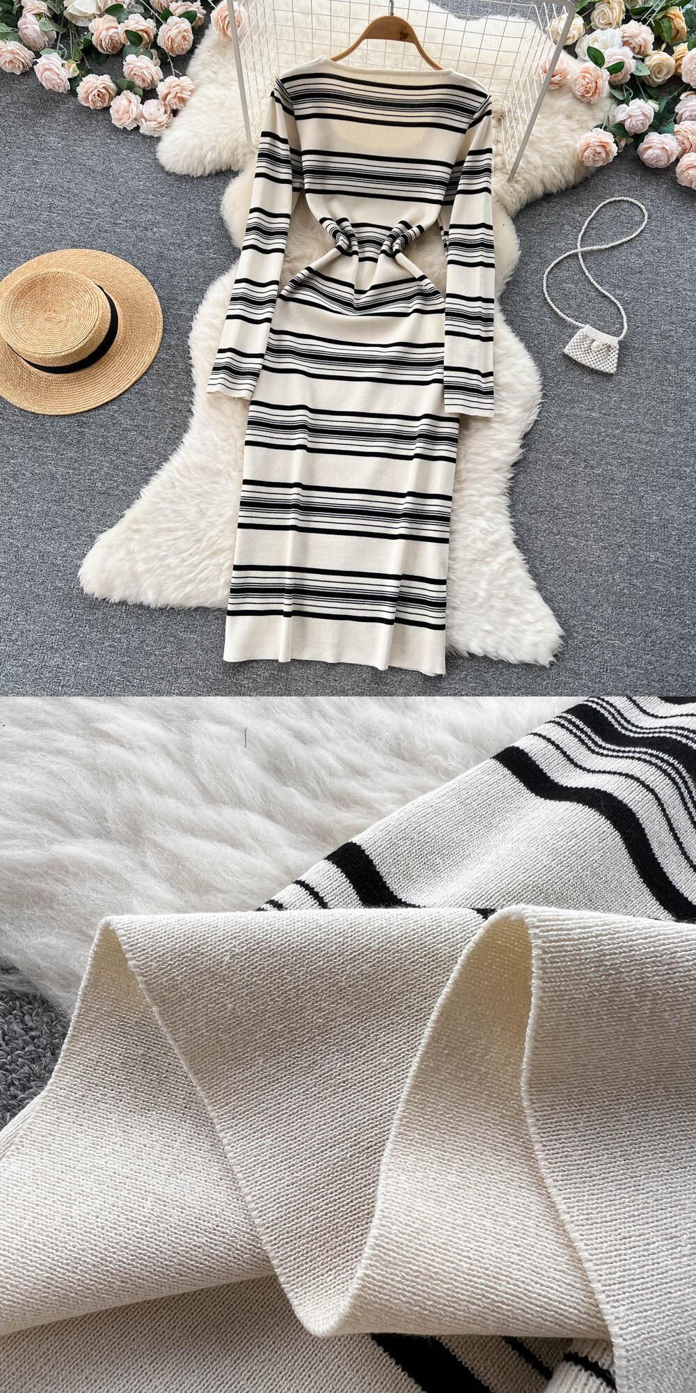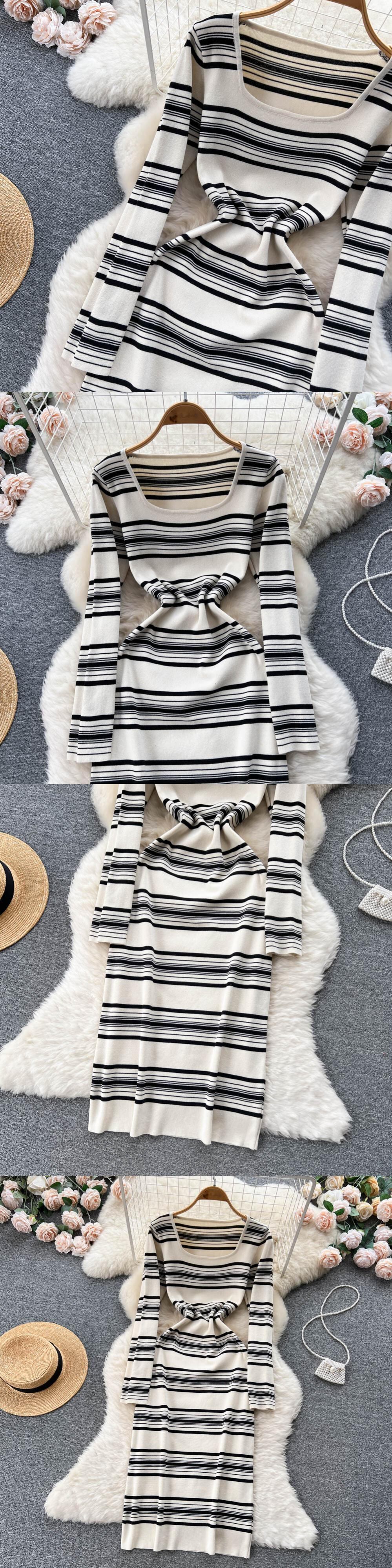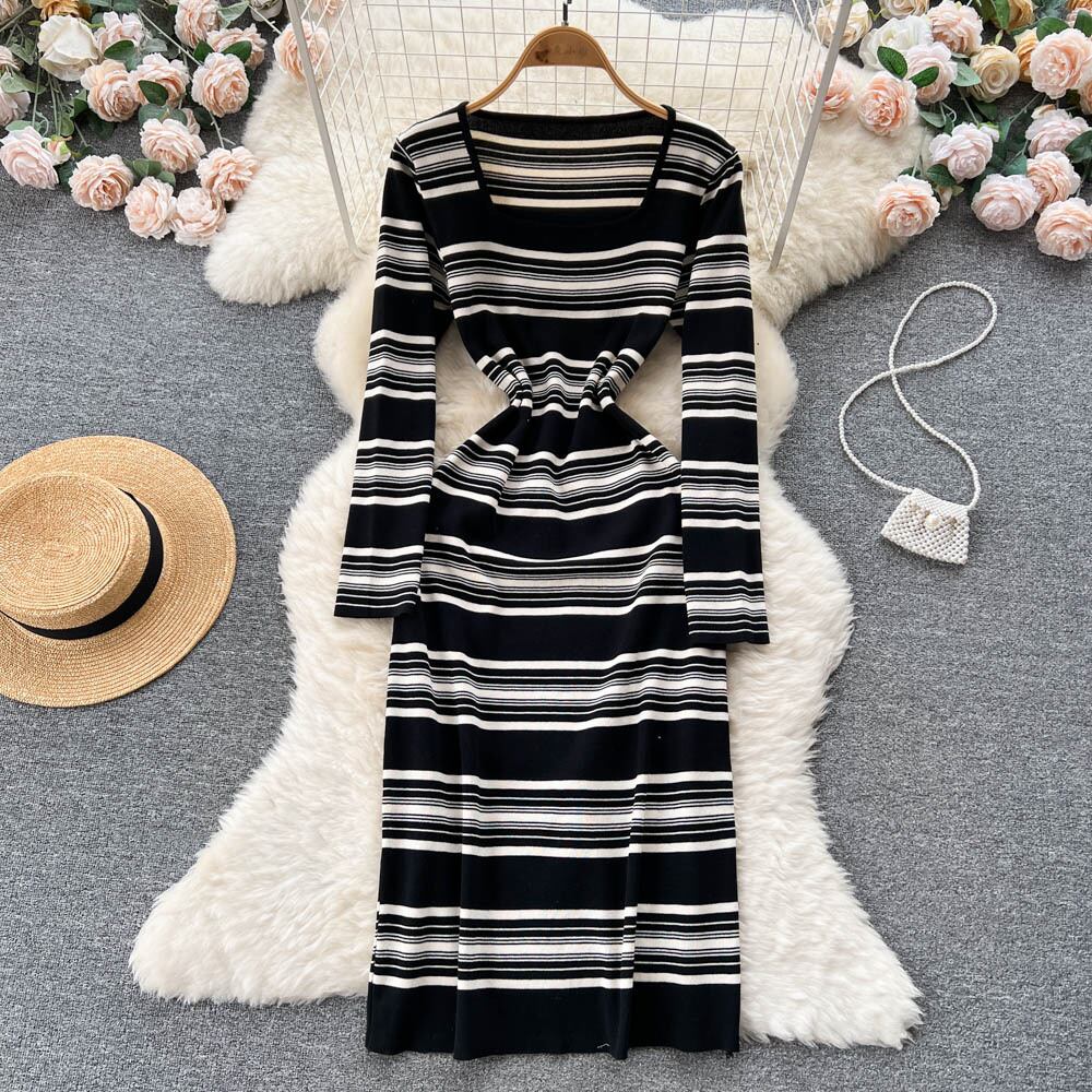 レディース ストライプ ニット ロングドレス スクエアカラー 長袖 ルーズフィット 潮 春秋 2022 スプリング 春物 オータム 秋物 スクウェア Abe11755529356