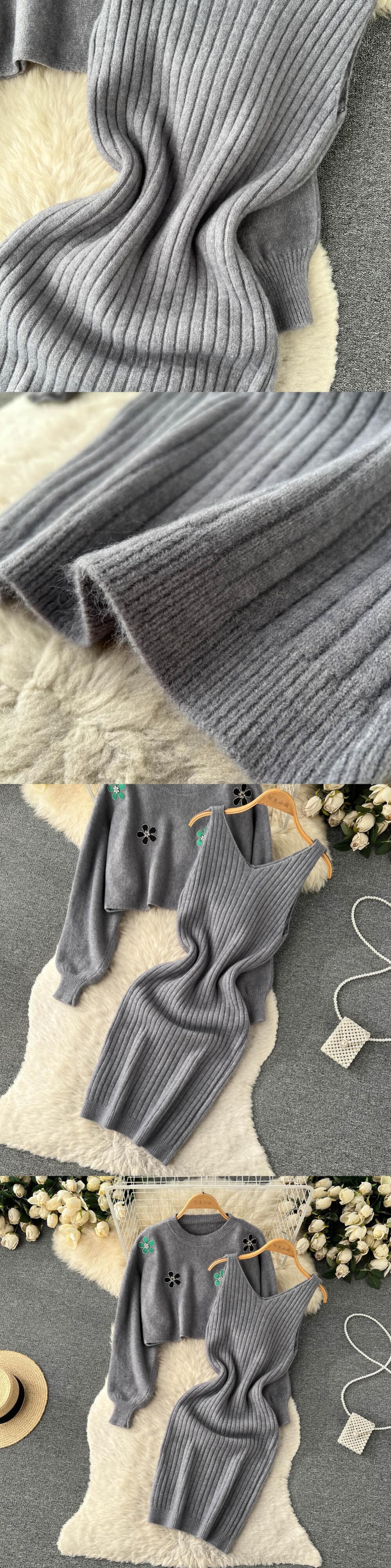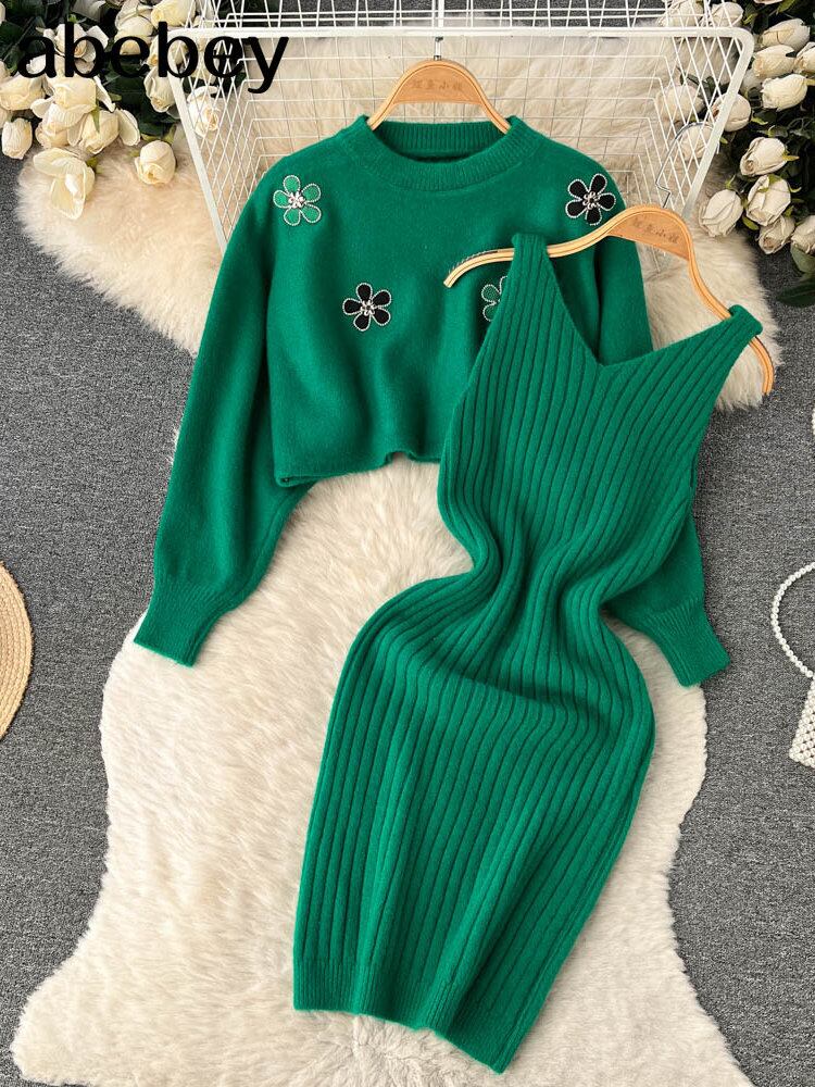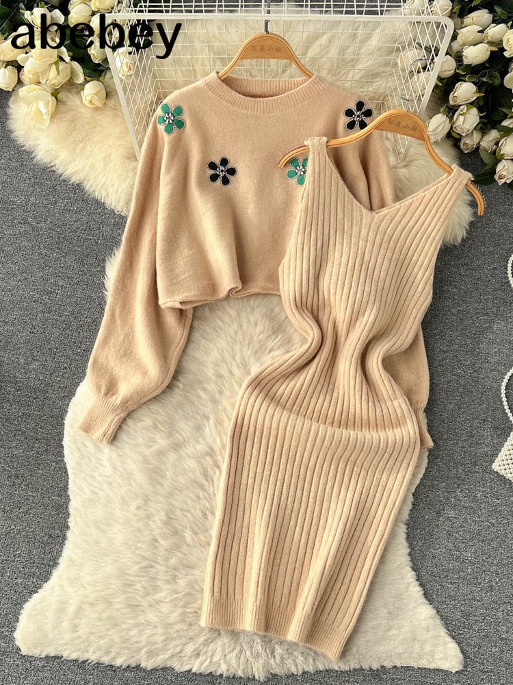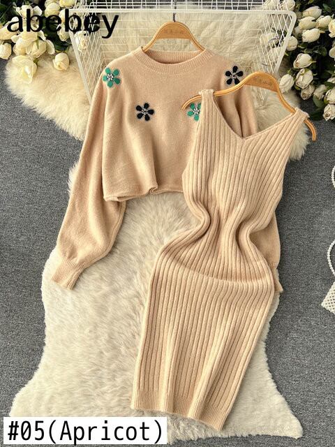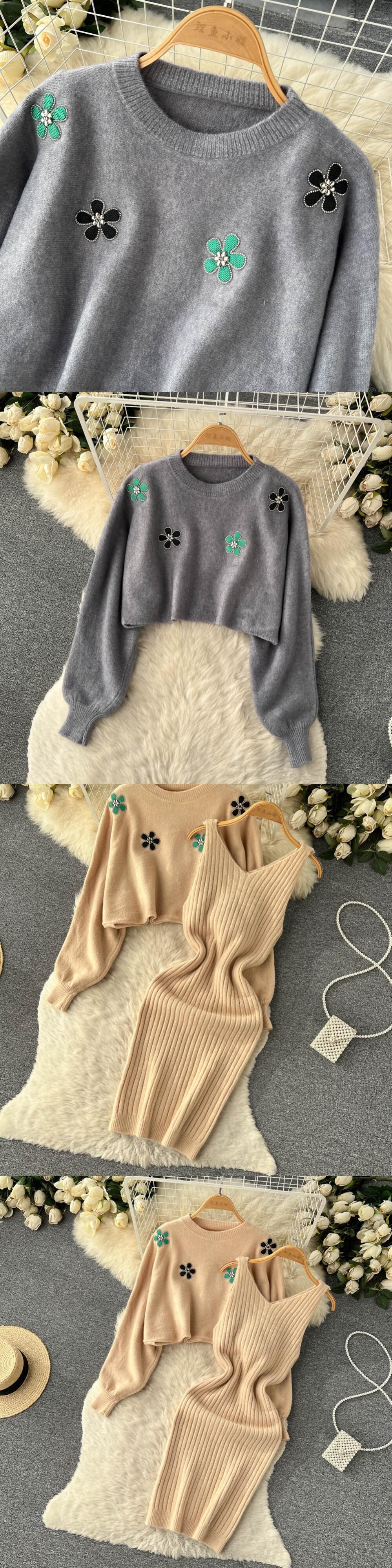 秋ニットセット女性ショートフラワーセーター + スリム V ネックミディニットドレス冬のセーター二枚スーツ オータム 秋物 ウィンター 冬物 Vネック フラワーデザイン Abe27186031882