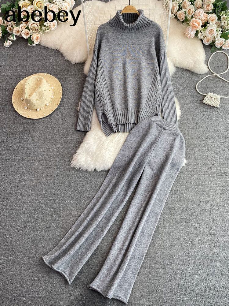 冬のツーピーススーツ長袖ニットタートルネックプルオーバー + 弾性ウエストワイドレッグパンツルーズセーターセット ロング エラスティック 伸縮 ウィンター 冬物 ワイドパンツ Abe12568336576