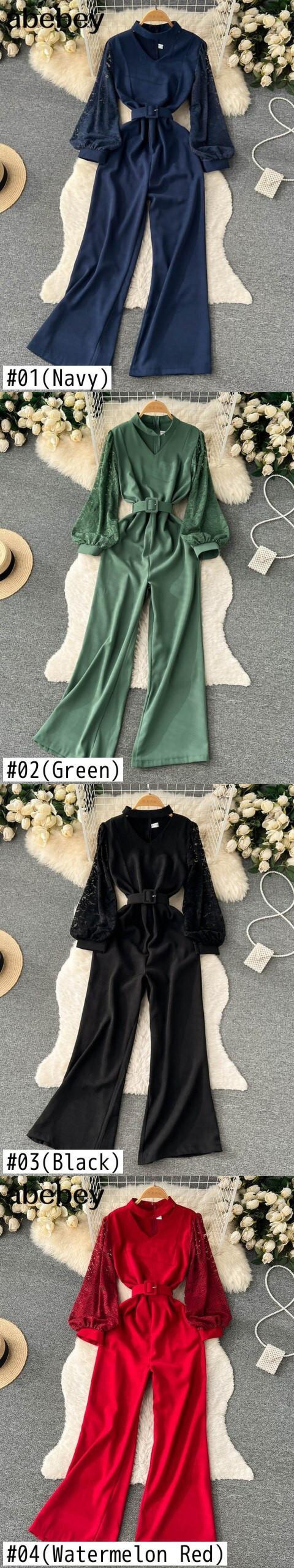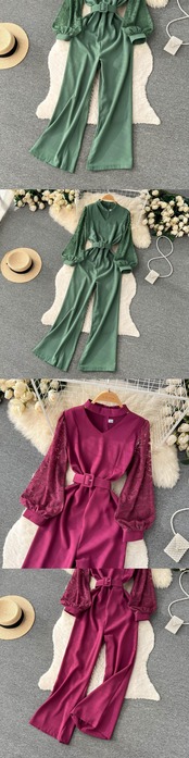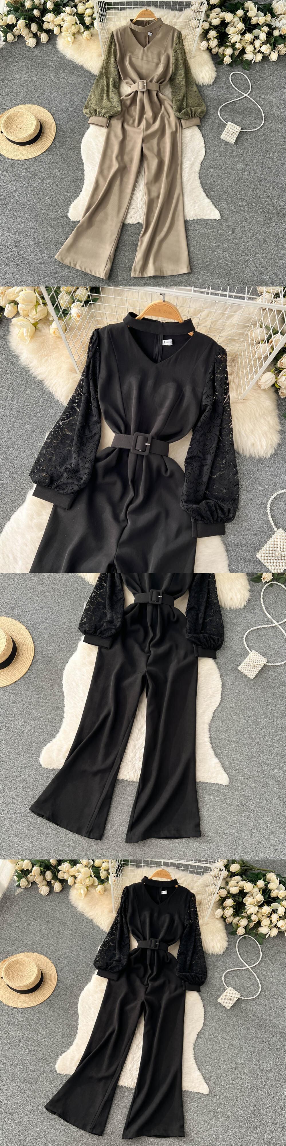 女性 2022 夏セクシーな長袖固体ジャンプスーツ刺繍レース緩い全体的なオフィスレディワイド脚ロンパース I65 ロング サマー 夏物 ワイドレッグ ワイドパンツ ソリッドカラー 会社 学校 通勤や通学にも Abe5689728063
