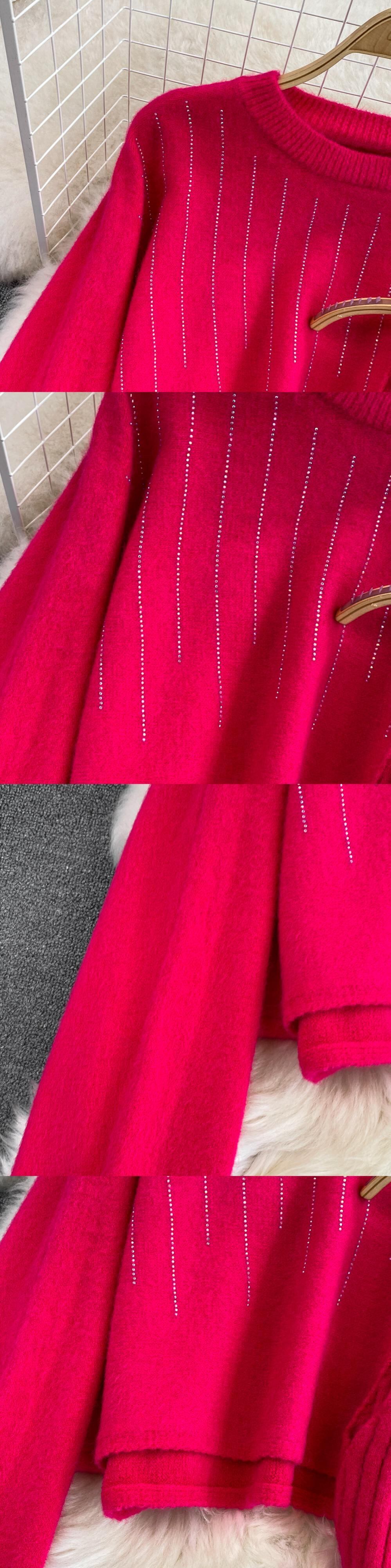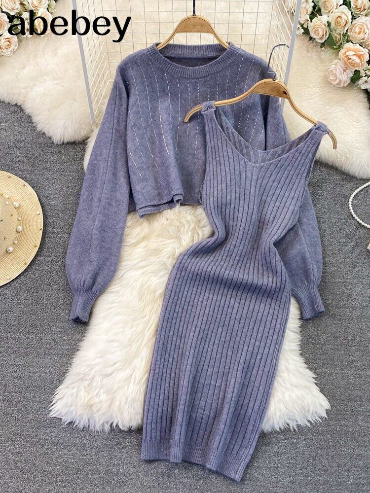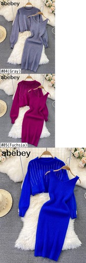 2022 ビーズニット女性セットルーズ長袖セーター + 固体弾性ドレスフレンチスタイルのツーピースセット ロング エラスティック 伸縮 ソリッドカラー Abe96545834635