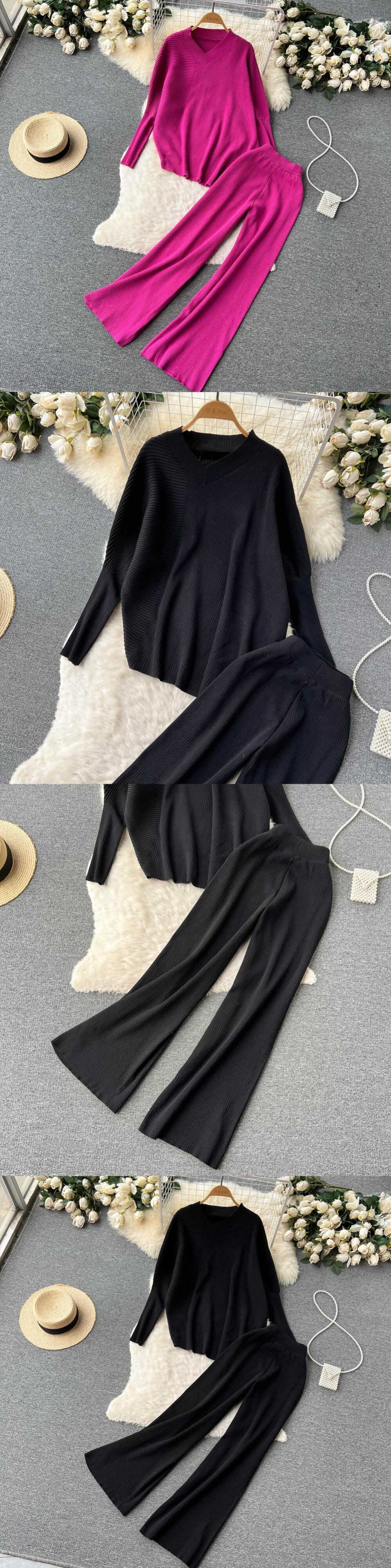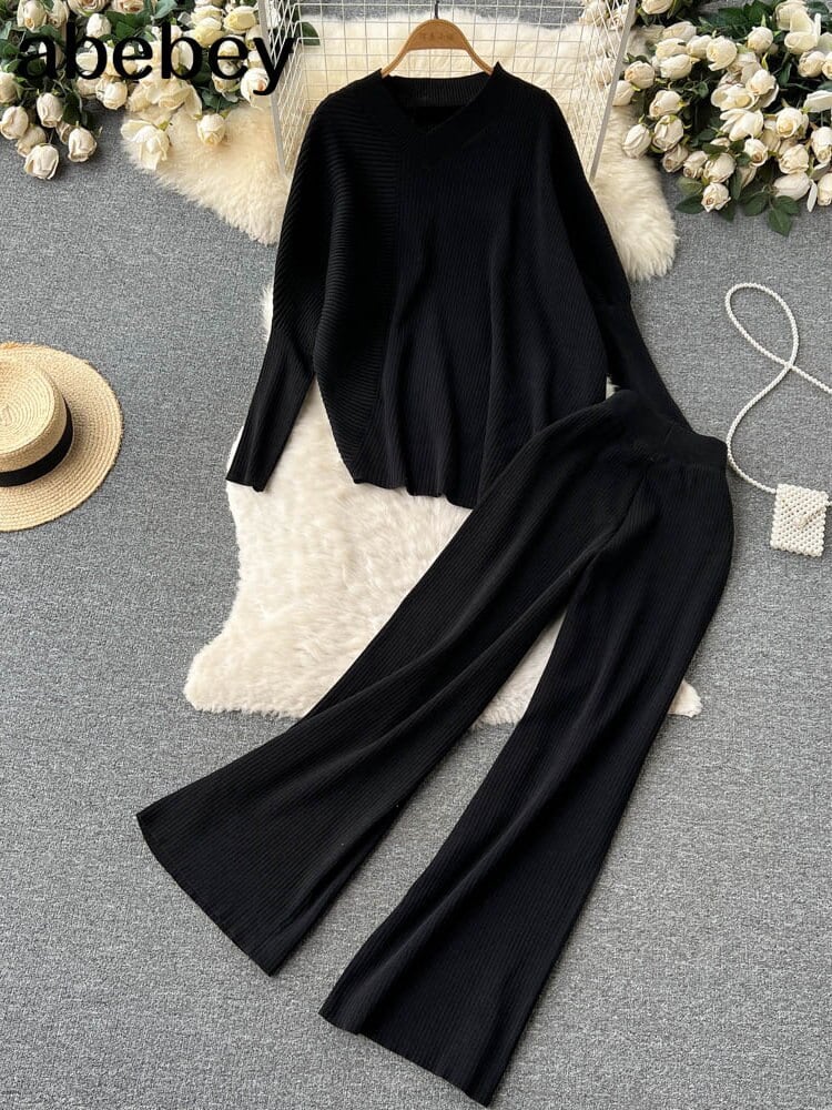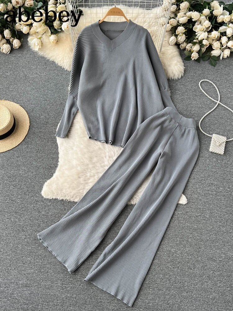 冬のツーピーススーツ長袖ニットトップコート + 弾性ウエストワイドレッグパンツルーズセーターセット ロング エラスティック 伸縮 ウィンター 冬物 ワイドパンツ Abe9253033190