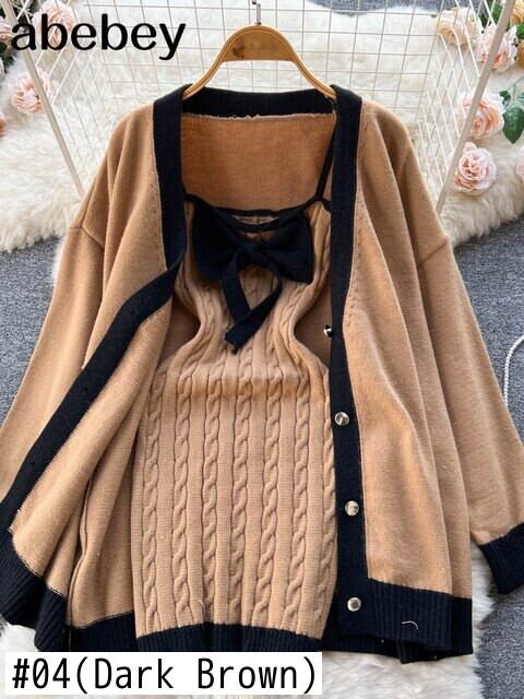 コントラストカラーニット女性セットルーズロングスリーブカーディガンセーター + 弾性ドレスフレンチスタイルツーピースセット衣装 長袖 エラスティック 伸縮 Abe48369790486