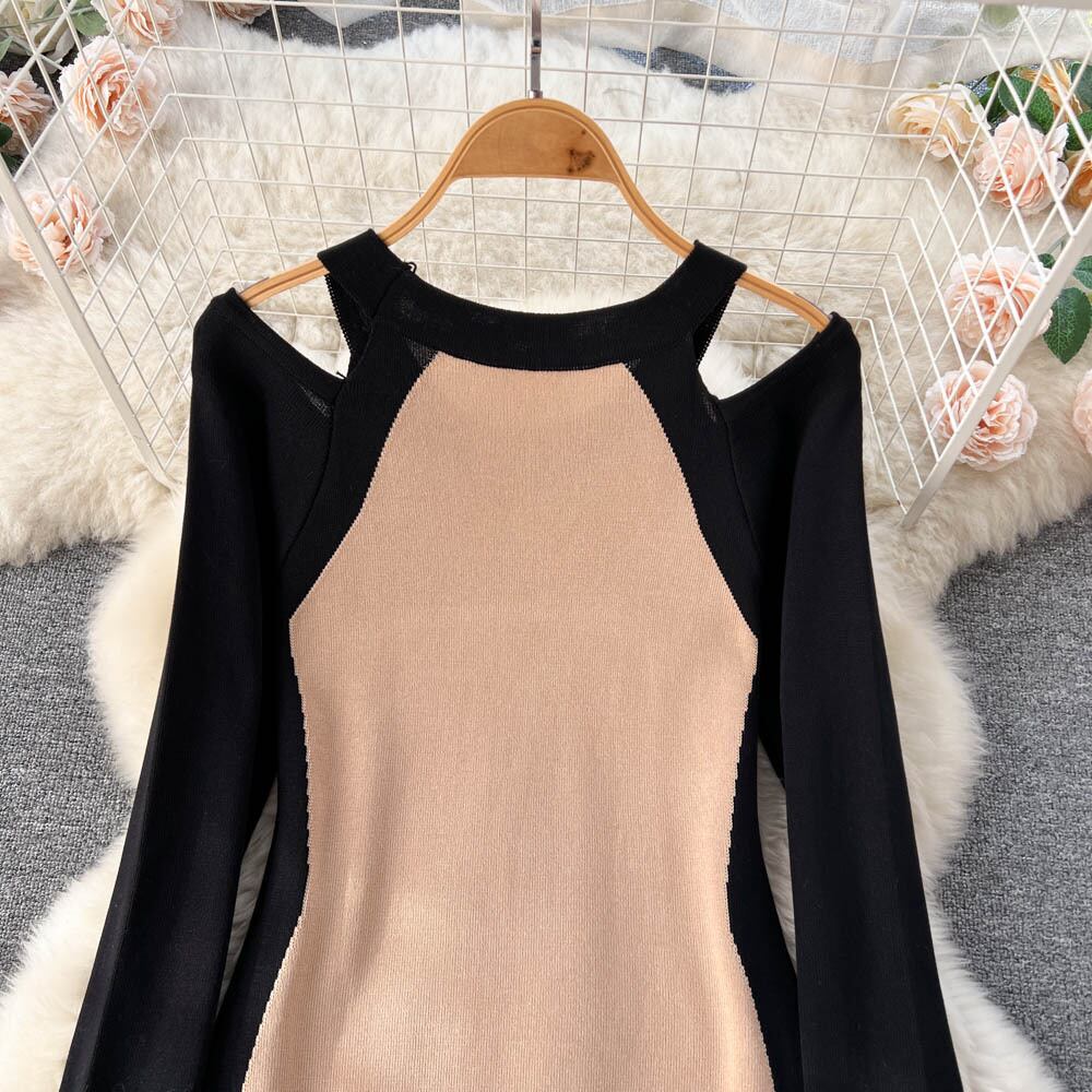 パッチワークセクシーなセータードレス 2022 女性 O ネック長袖マキシロングドレス秋のストリートニットボディコンドレス オータム 秋物 Oネック Abe31503531567