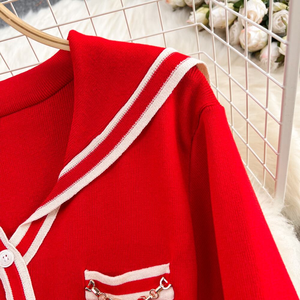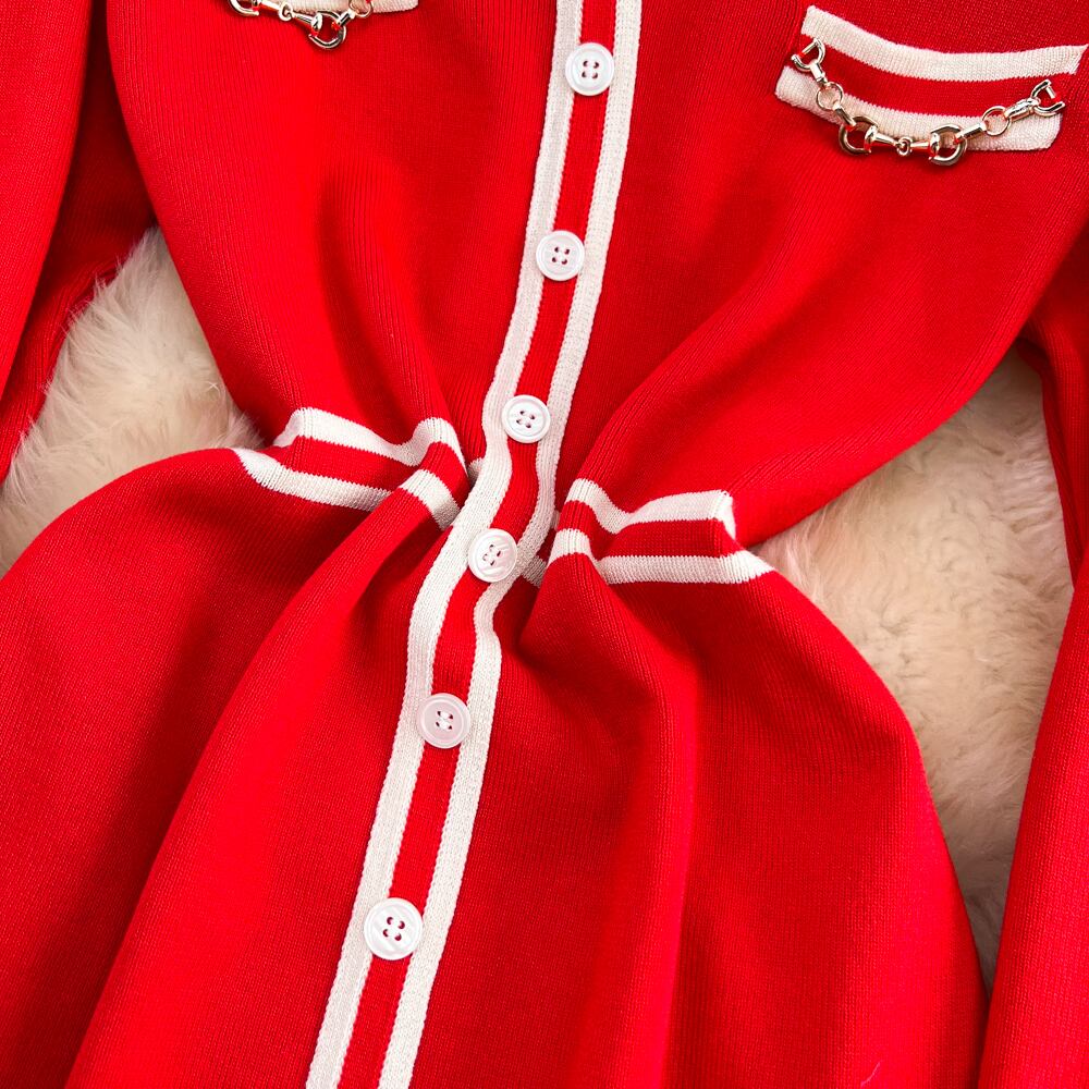 女性ニットドレス赤シングルブレスト V ネック長袖弾性ウエストスリム 2022 秋 ロング レッド エラスティック 伸縮 オータム 秋物 Vネック Abe49340478981