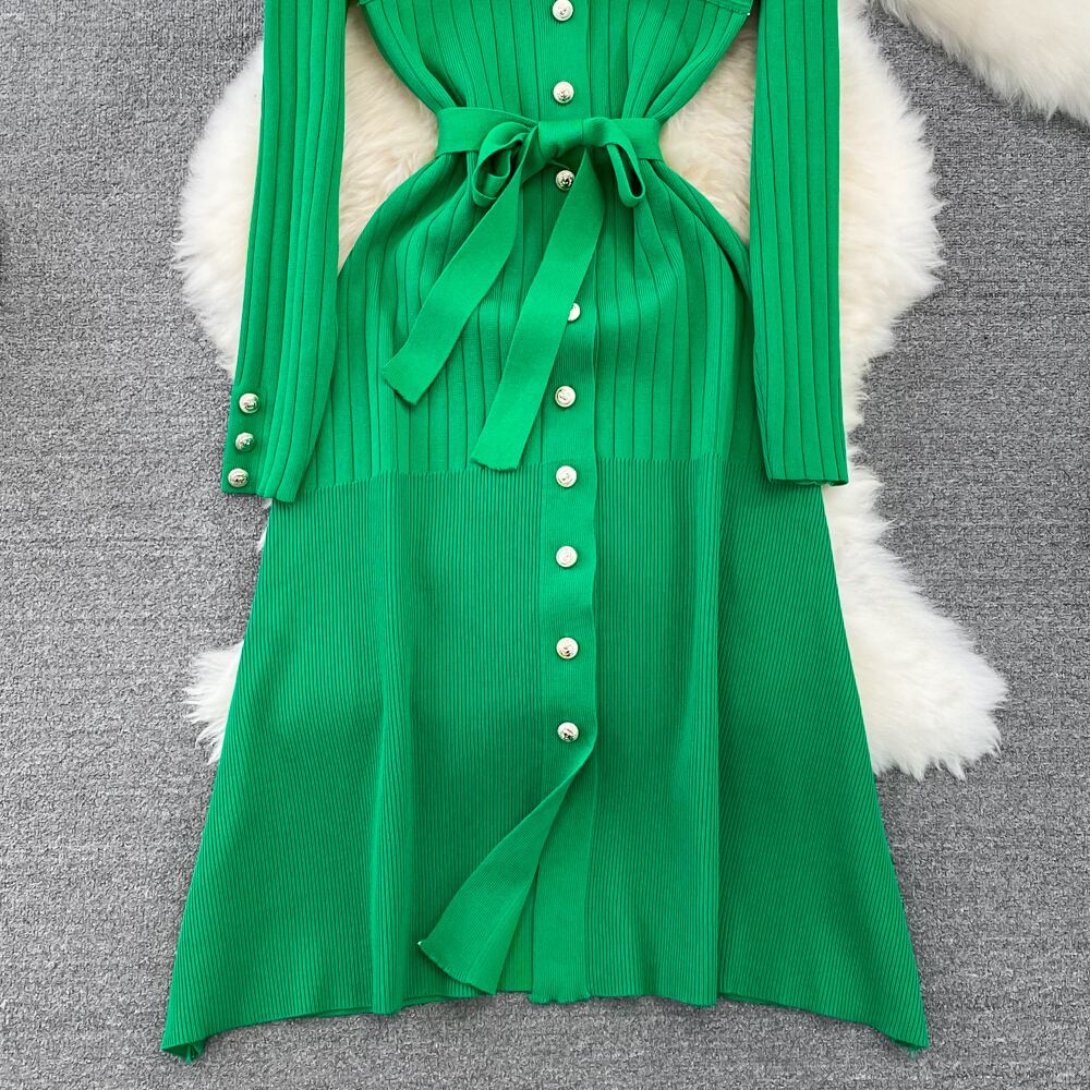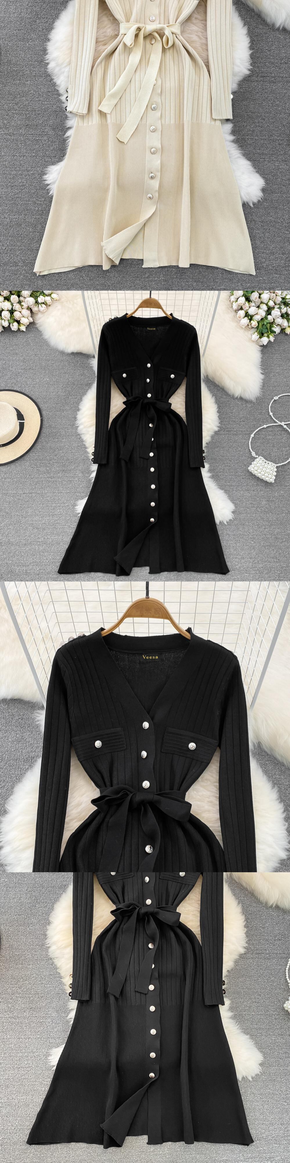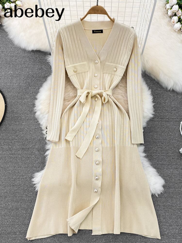 ボタン ベルト ニット女性ドレス V ネック長袖レトロ フレンチ スタイル スリム A ライン セーター ドレス ロング ハーネス Vネック Aライン Abe84150161689