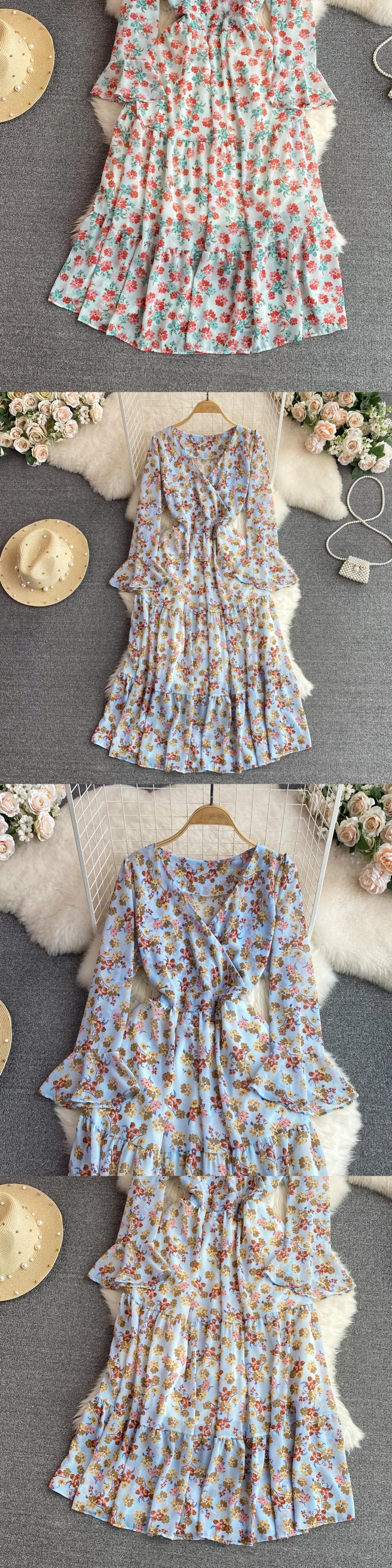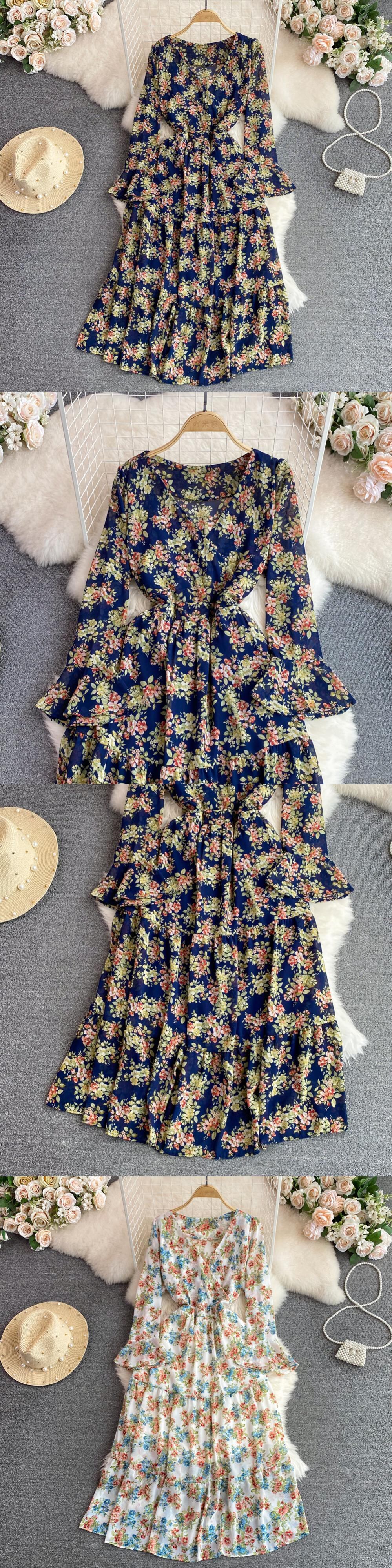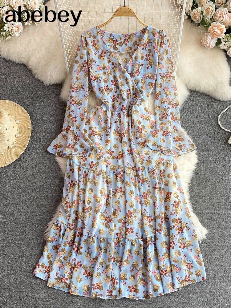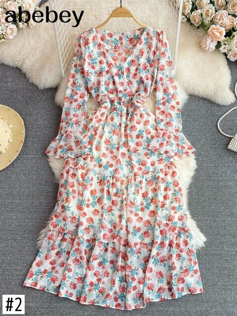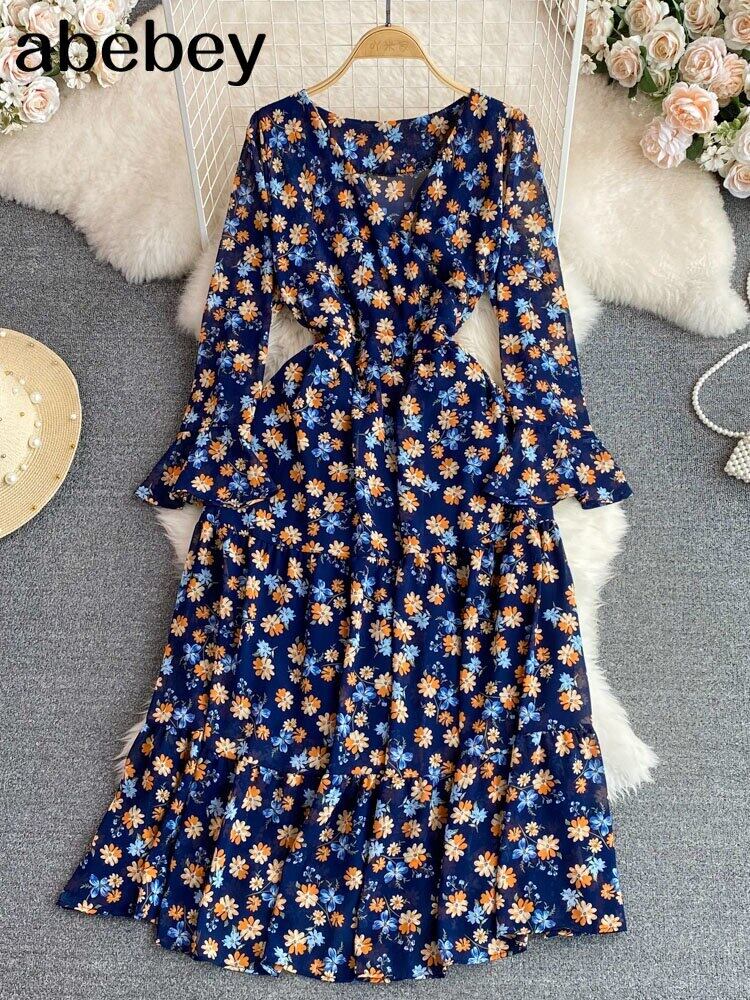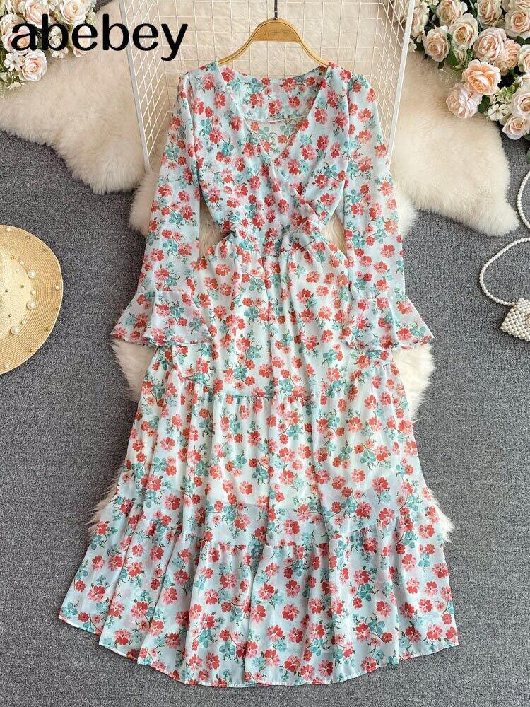2022 女性の花柄 V ネックドレス長袖中空アウト A ライン Vestidos 秋スリムミディドレス ロング オータム 秋物 Vネック Aライン Abe77427621925