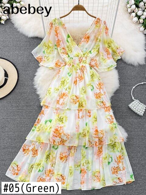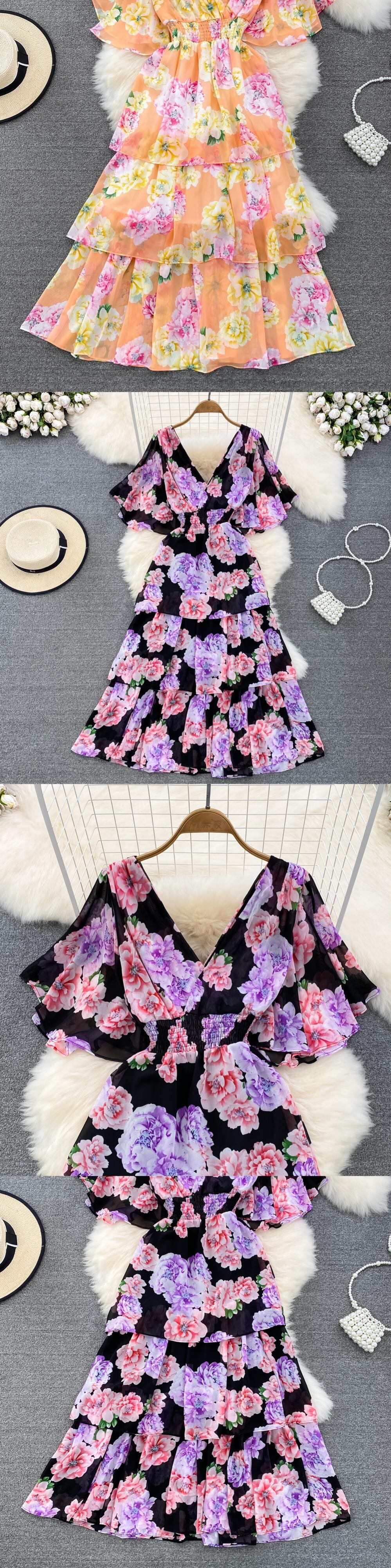 ボヘミアプリントバタフライスリーブサマードレス女性 V ネックサッシュフリルミディドレス 2022 パーティードレス ラッフル 夏物 Vネック Abe94766158544