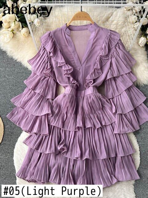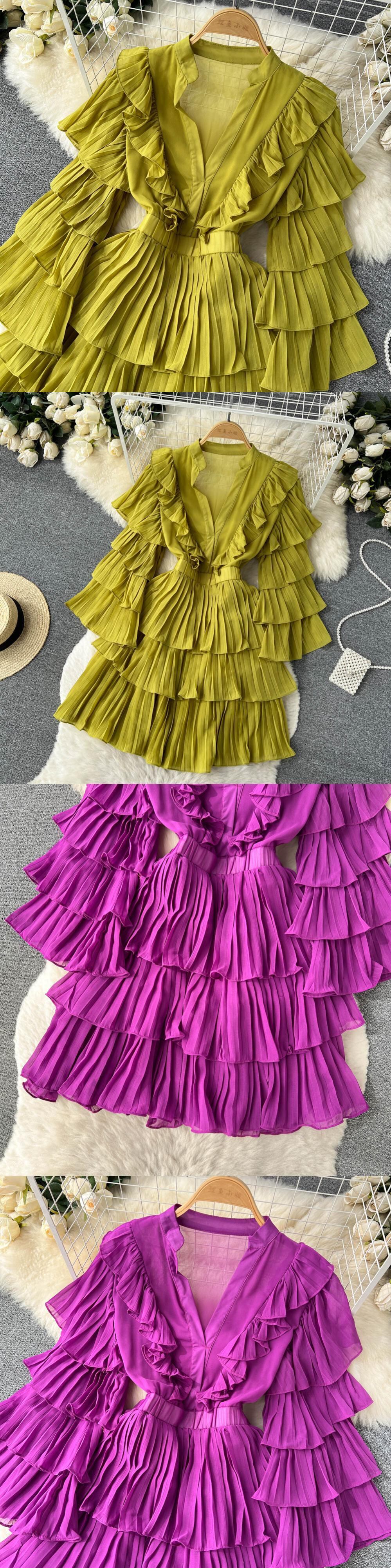 女性ドレスレトロスーパーフェアリー V ネック長袖ウエストプリーツシフォンケーキミニドレス 2022 夏 ロング サマー 夏物 Vネック Abe53028479190