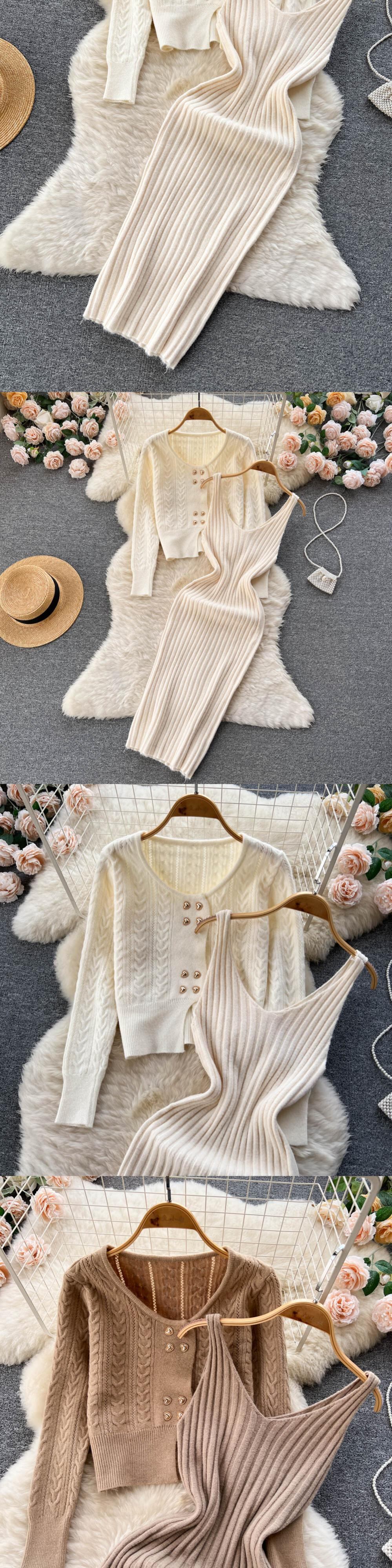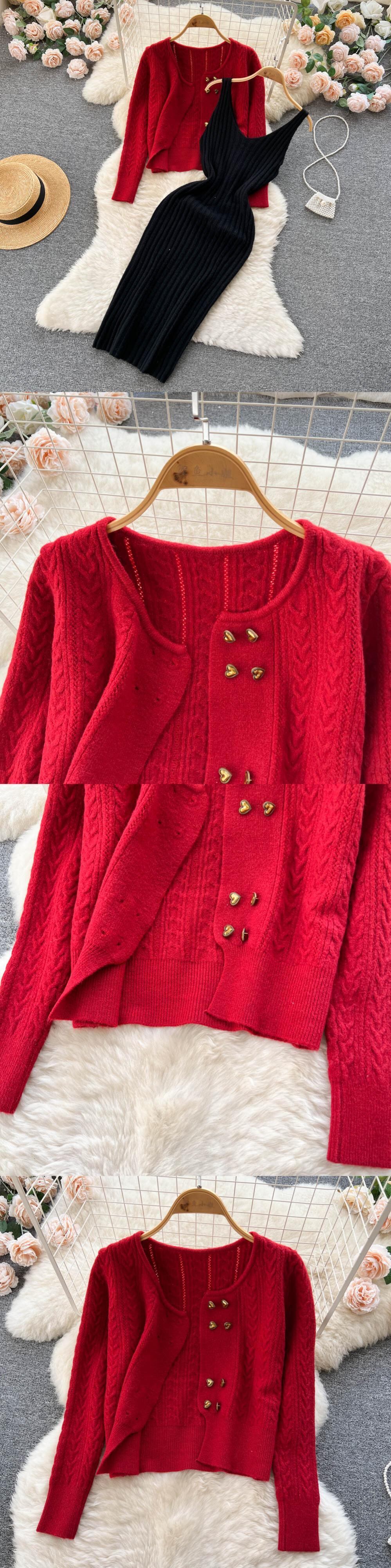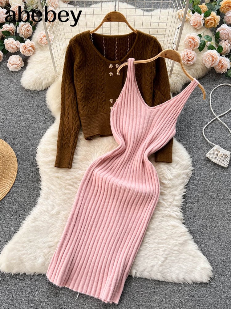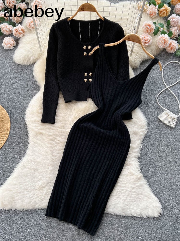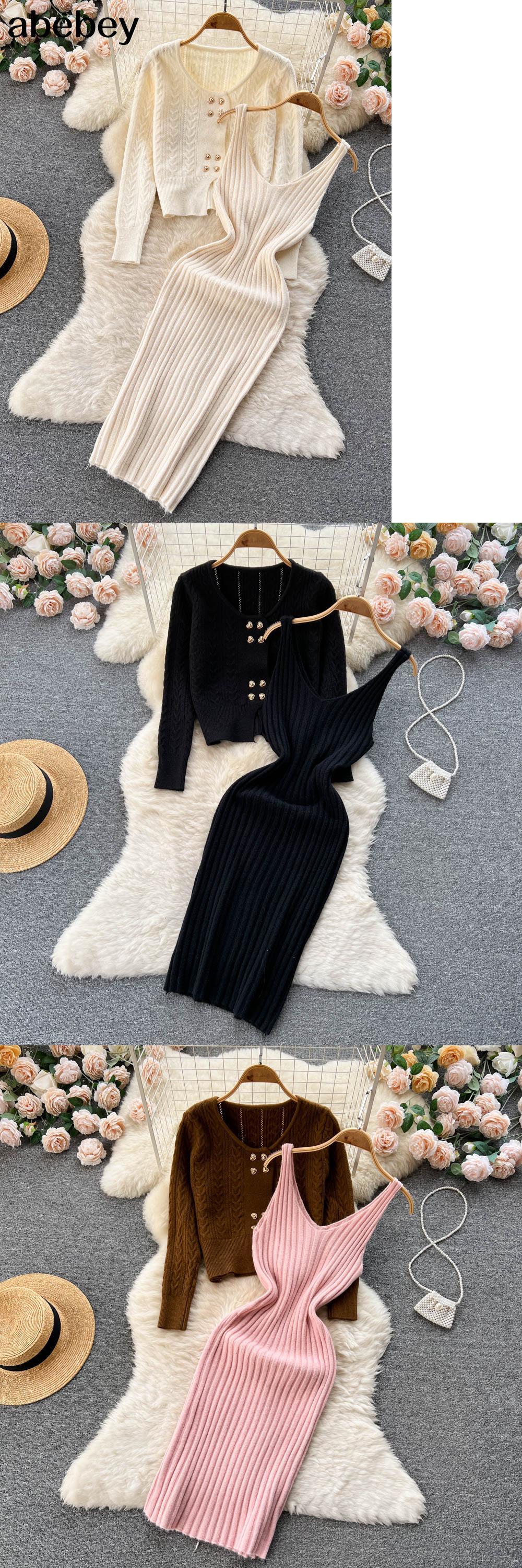 2022 冬のツーピーススーツ長袖ニットカーディガンコート + 固体弾性ドレスフレンチスタイル 2 点セット衣装 ロング エラスティック 伸縮 ウィンター 冬物 ソリッドカラー Abe47745827928