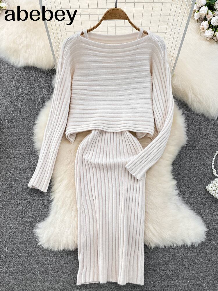 女性スリムツーピースセットセータードレス秋冬ウエストニットアンサンブルミディアムロングパーティードレス オータム 秋物 ウィンター 冬物 Abe32180348987