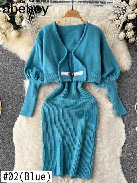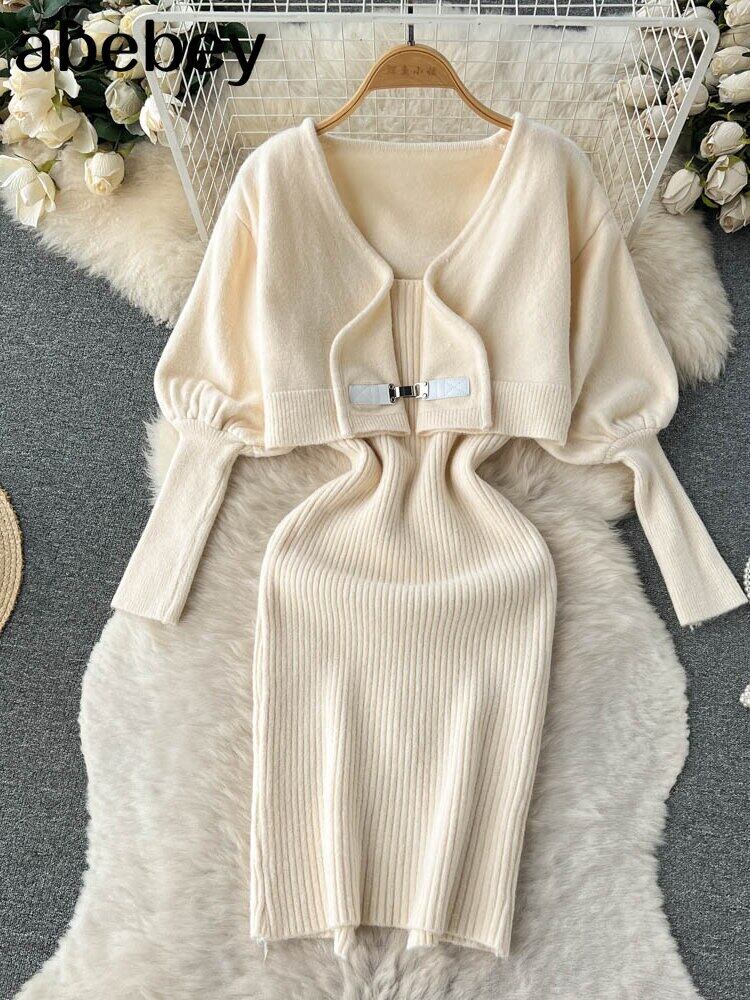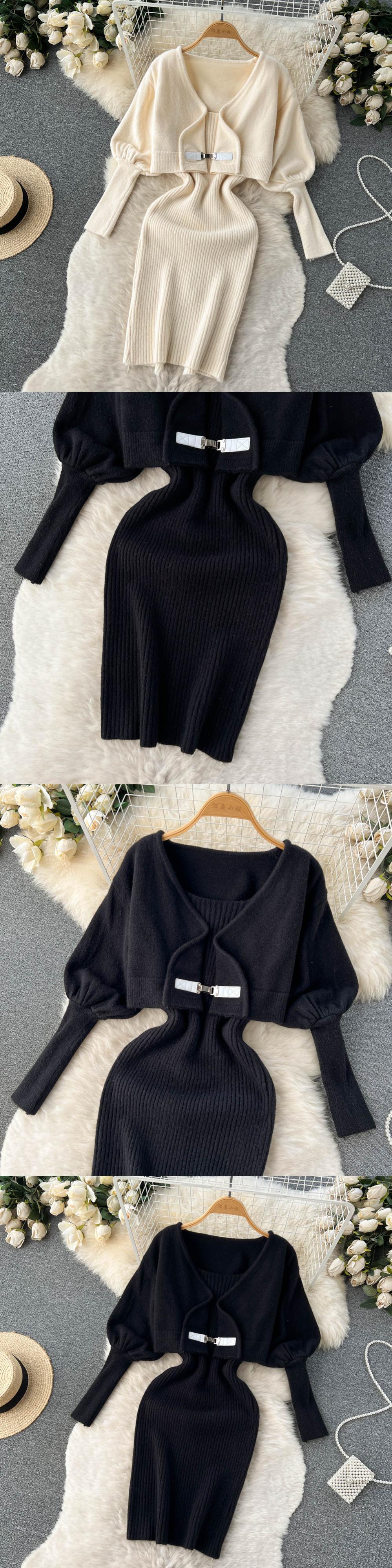 女性固体 OL セータースーツ冬のランタンスリーブショールカーディガントップ + ミディロングキャミドレスニット 2 枚セット ウィンター 冬物 ソリッドカラー Abe92898171510