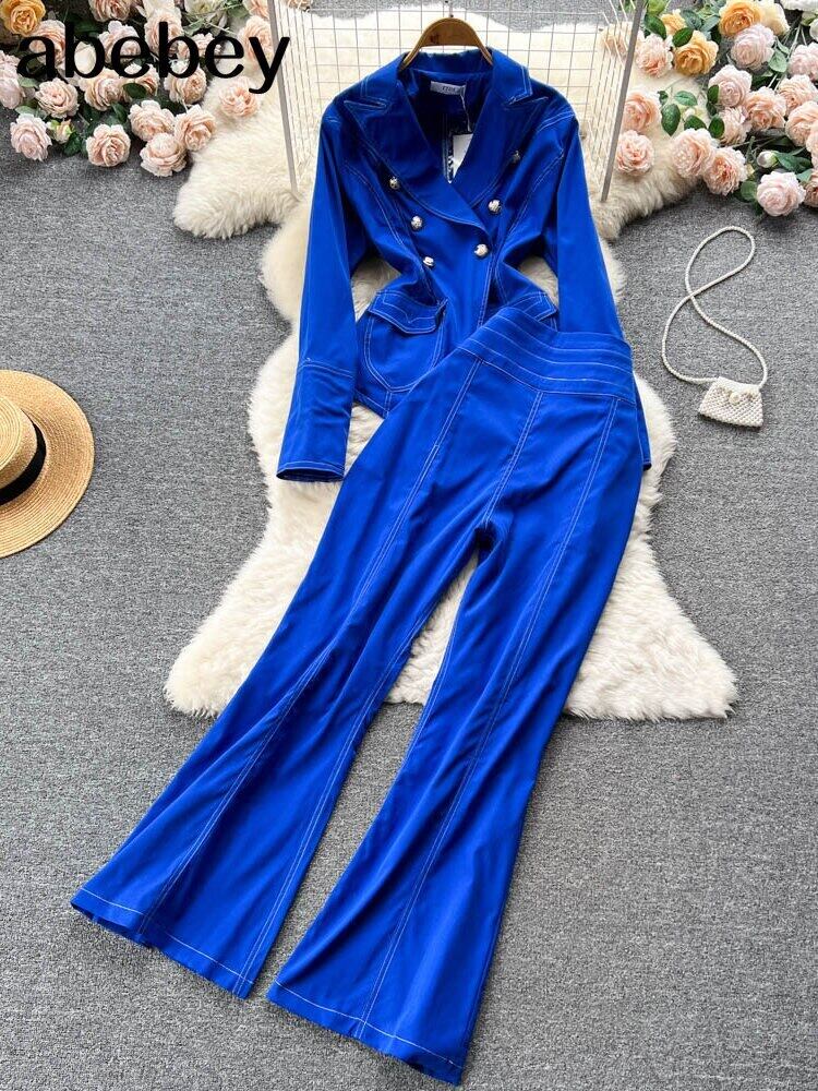 女性プロフェッショナルOLラペル長袖スーツルーズトップコート+ストレートシーススーツパンツ2点セット ロング Abe22930321953