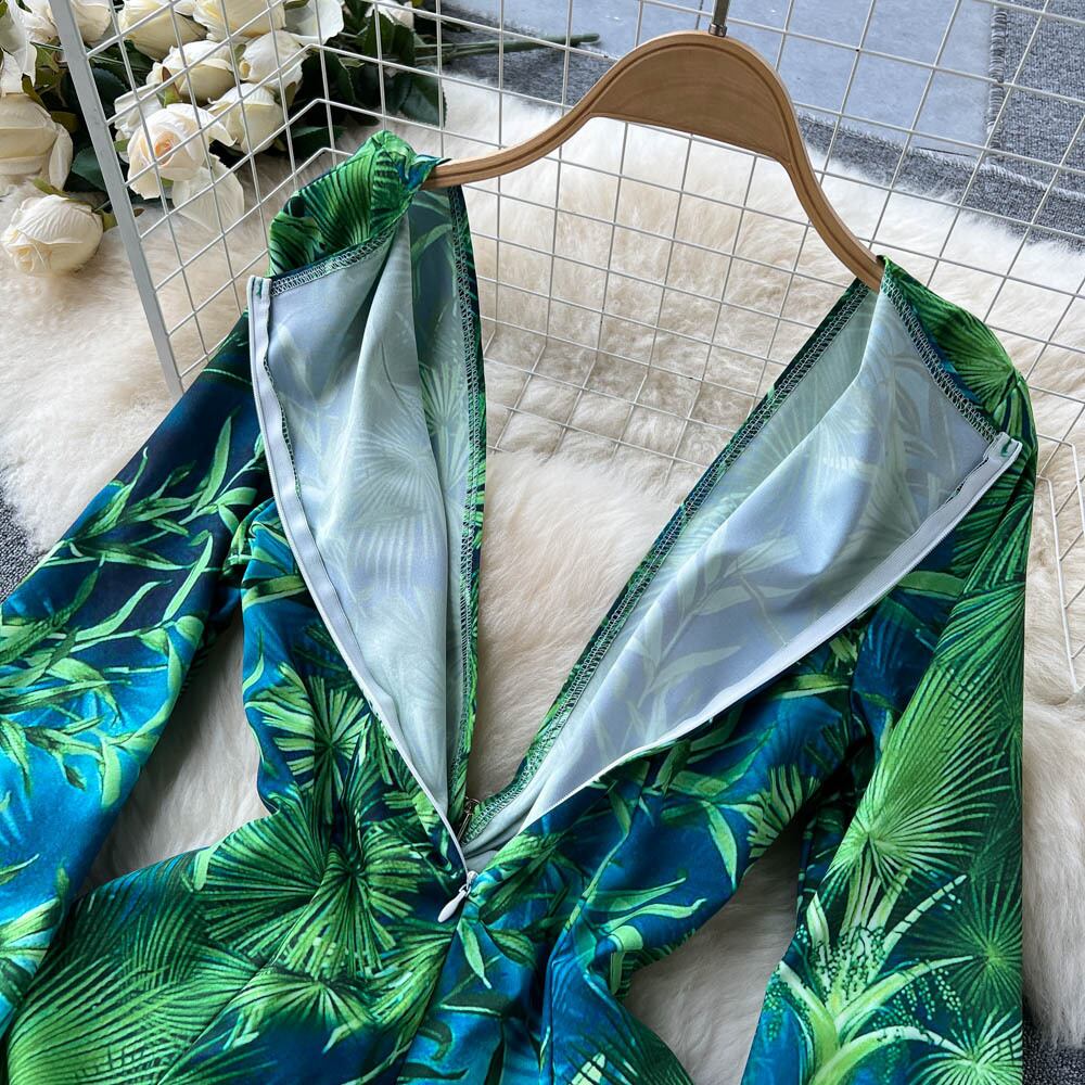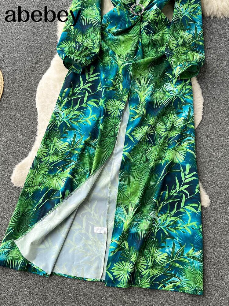 2023 女性シフォンディープ V ネックシルトリーフパターンマキシグリーンバケーションロングドレス Vネック Abe68622260352