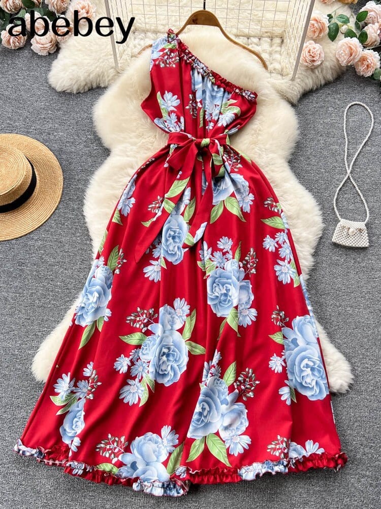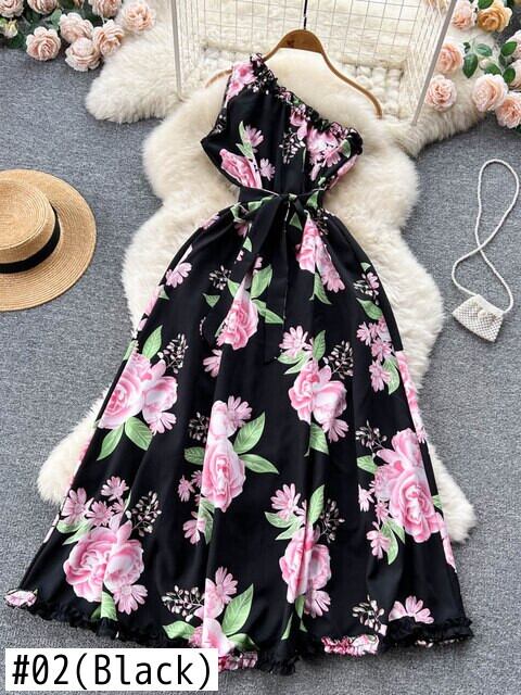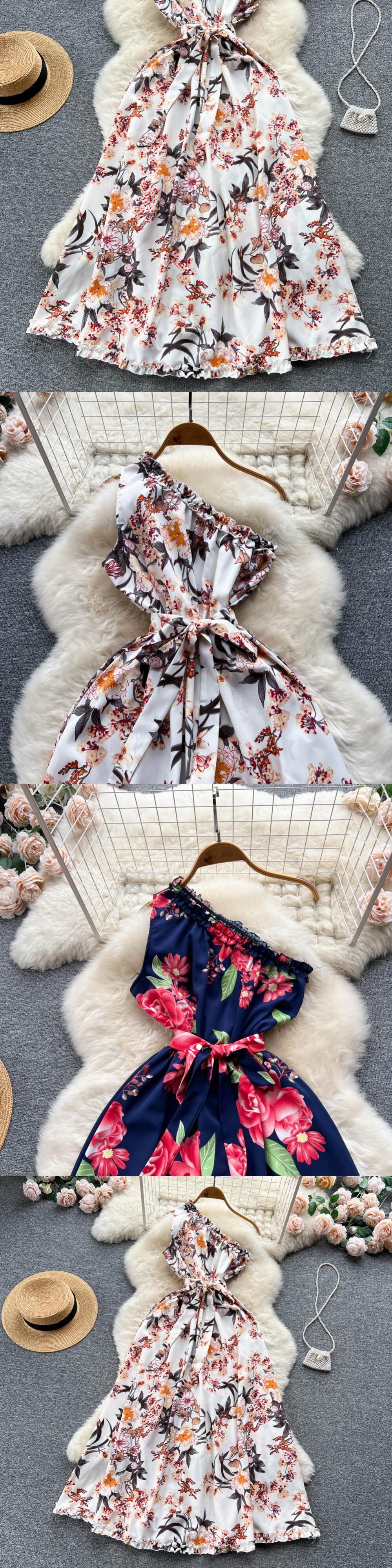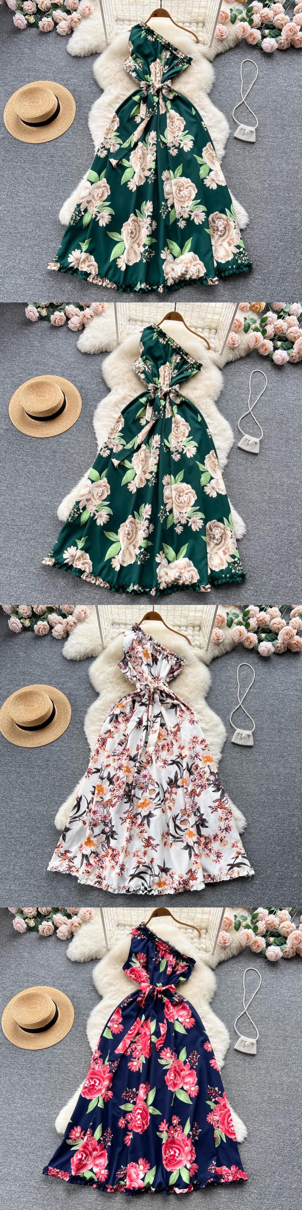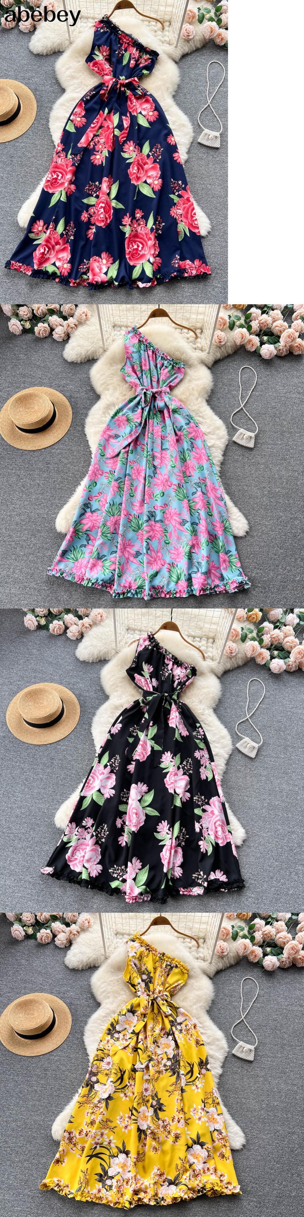 不規則なフリル花柄ドレスサッシ女性の夏 2022 休暇スリムセクシーな A ラインロングドレス サマー 夏物 Aライン Abe12884887992