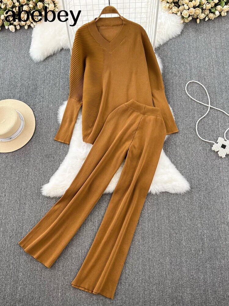 女性 V ネック ニット スーツ長袖ルーズ セーター + 弾性ワイドレッグ ロング パンツ冬 OL 暖かい 2 点セット エラスティック 伸縮 ウィンター 冬物 Vネック ワイドパンツ Abe52361771987