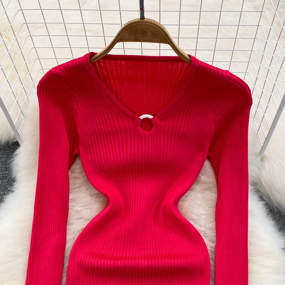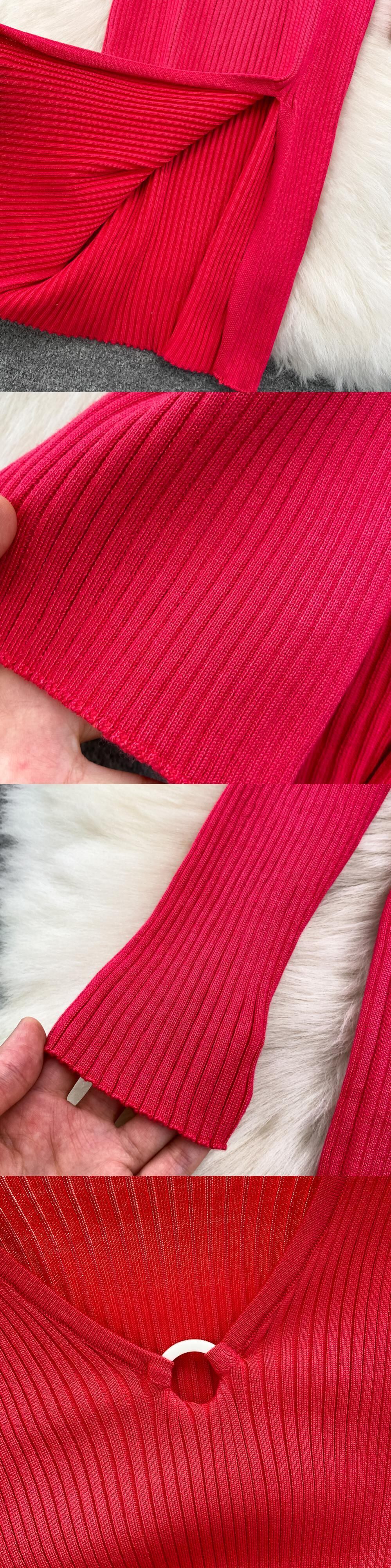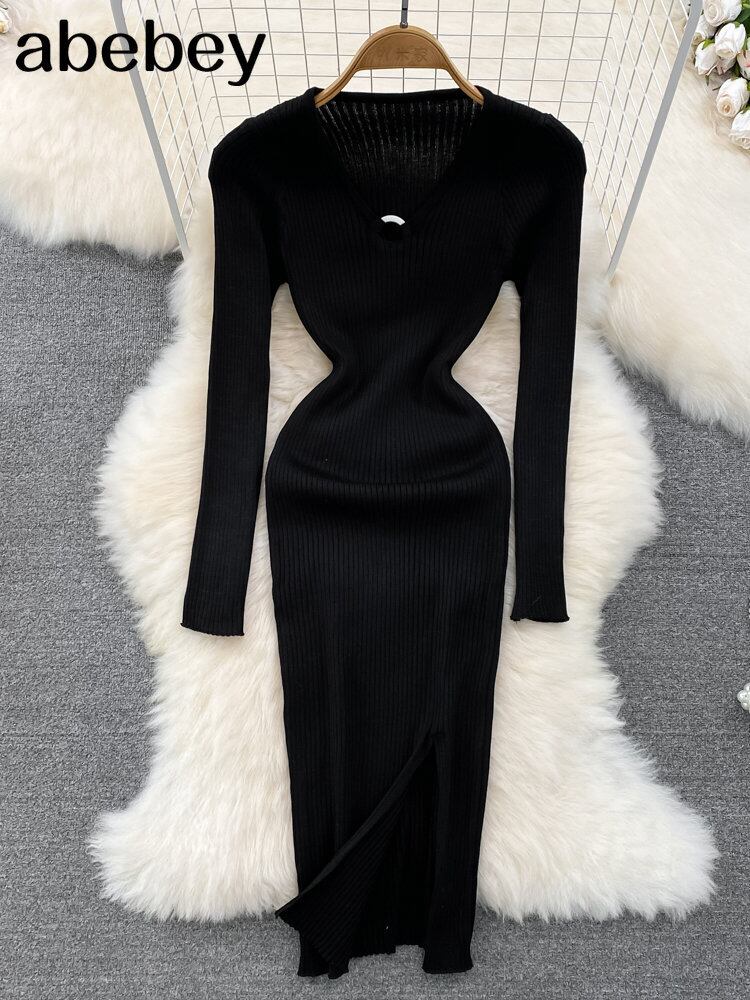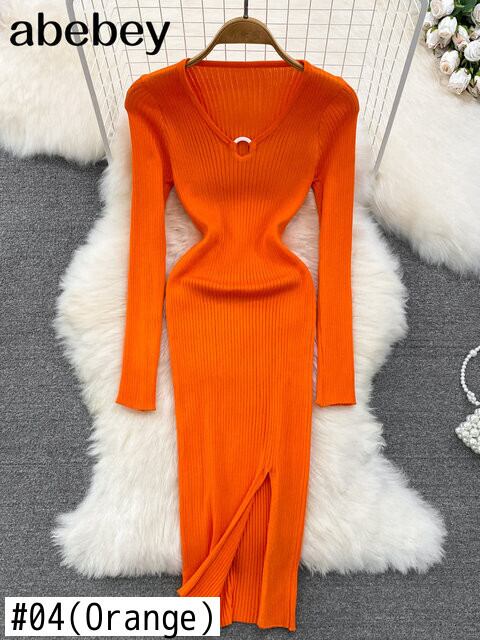 女性ニットドレス長袖 V ネック弾性スリムペンシルドレス 2022 秋のセクシーなボディコンセータードレス ロング エラスティック 伸縮 オータム 秋物 Vネック Abe47134222602