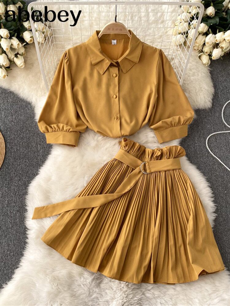 2 ピースセット女性の夏のターンダウン襟クロップトップシャツプリーツミニスカートセットトラックスーツラウンジクラブ衣装ストリート サマー 夏物 Abe92165926560