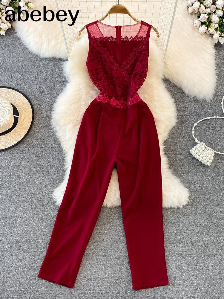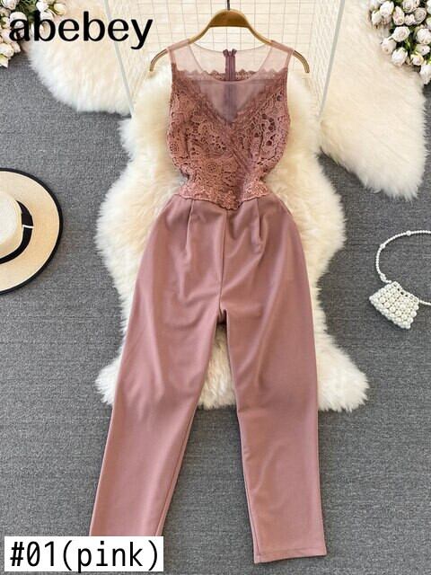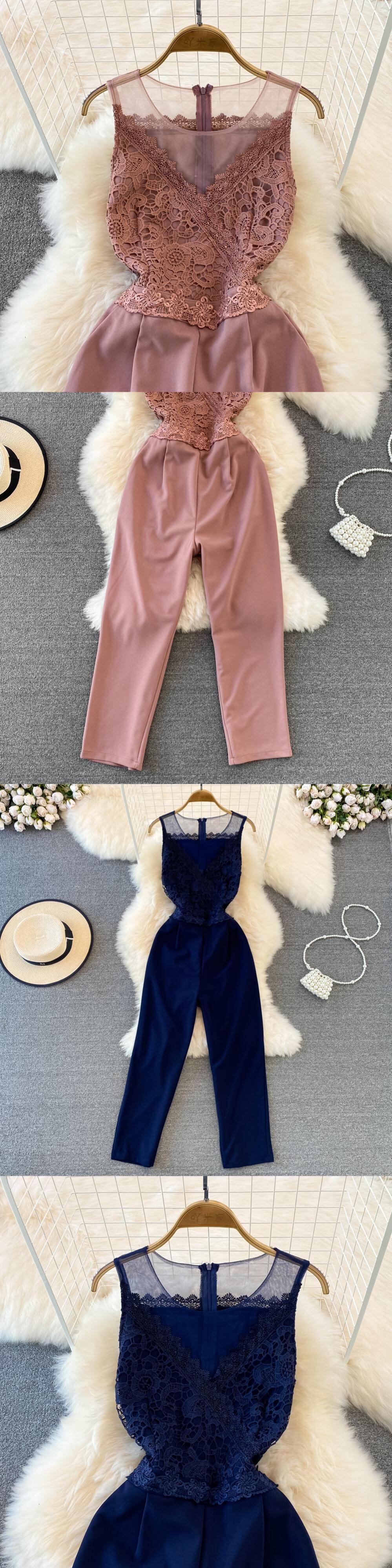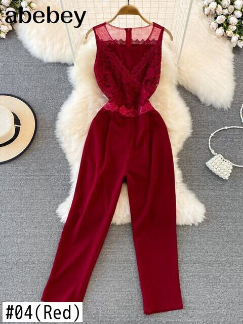ジャンプスーツ女性レースパッチワーク V ネックウエスト夏 Combinaison ソリッドボディスーツ サマー 夏物 Vネック ソリッドカラー Abe8875506476