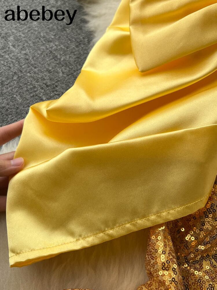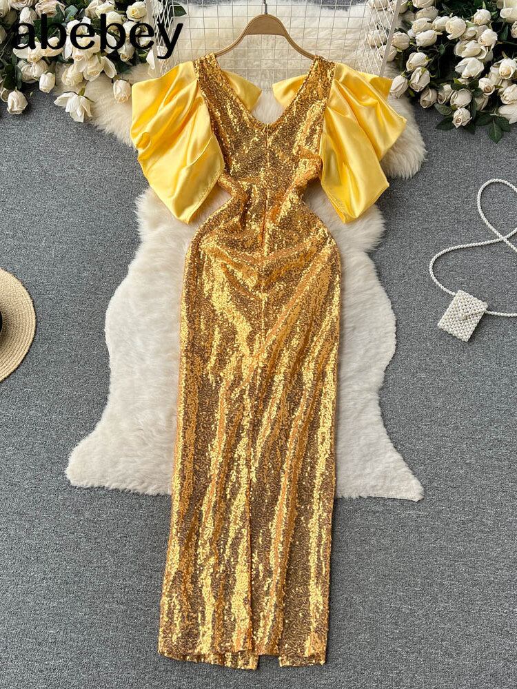とセクシーなロングイブニングドレス高級グリッタースパンコールディープ V ネックボウタイパフスリーブゴールドパーティーウエディングクリスマスイブニングガウン リボン Vネック Abe52749947053