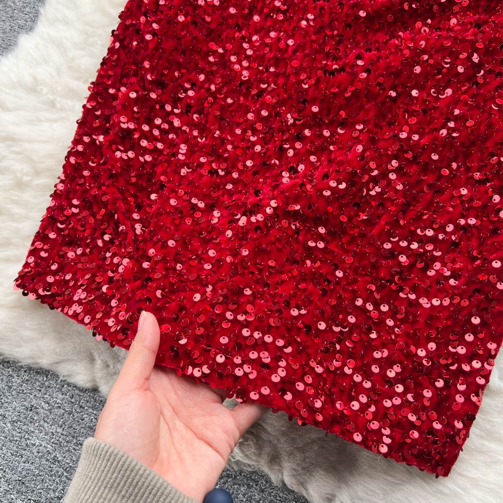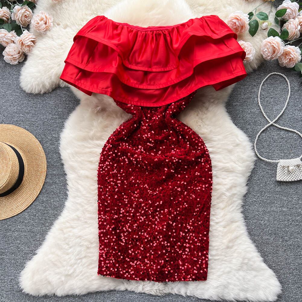 女性パーティー赤いドレスベルベットスパンコール夏オフショルダー胸ラップフリルグリッターボディコン誕生日ガウン レッド サマー 夏物 Abe34738563522