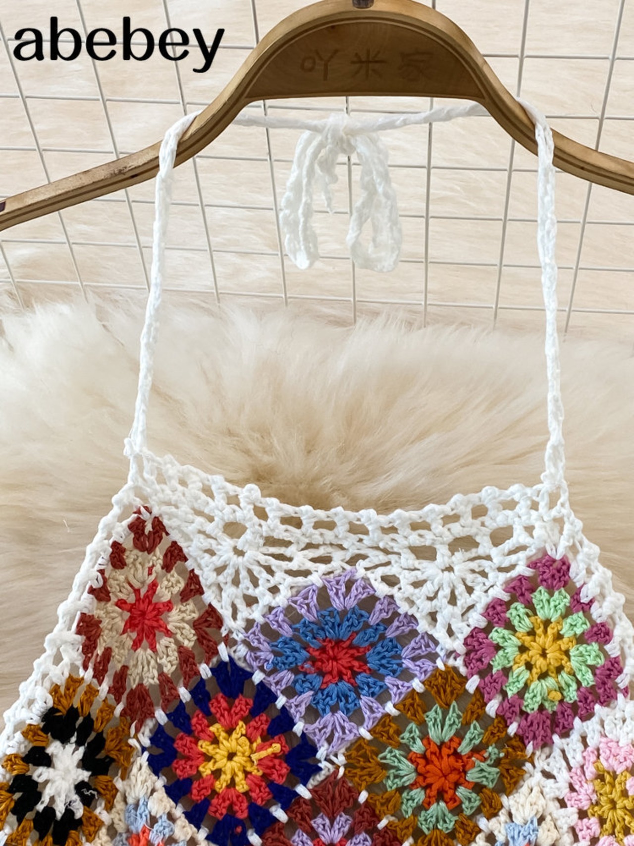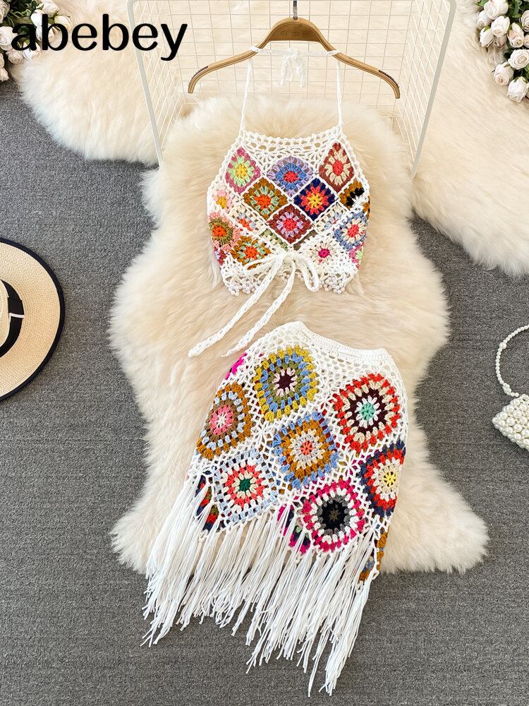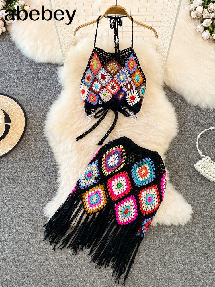ビーチホリデーレトロニットセット女性ホルターミニキャミソール + ショート Tel スカート 2023 夏セクシーな二枚スーツ サマー 夏物 Abe60082512902