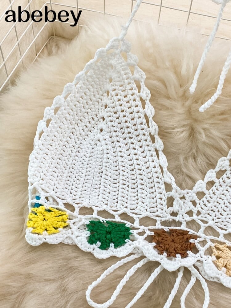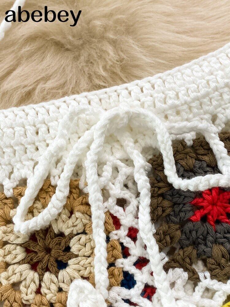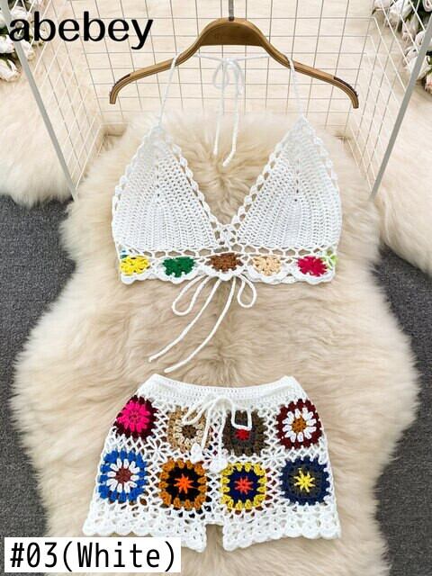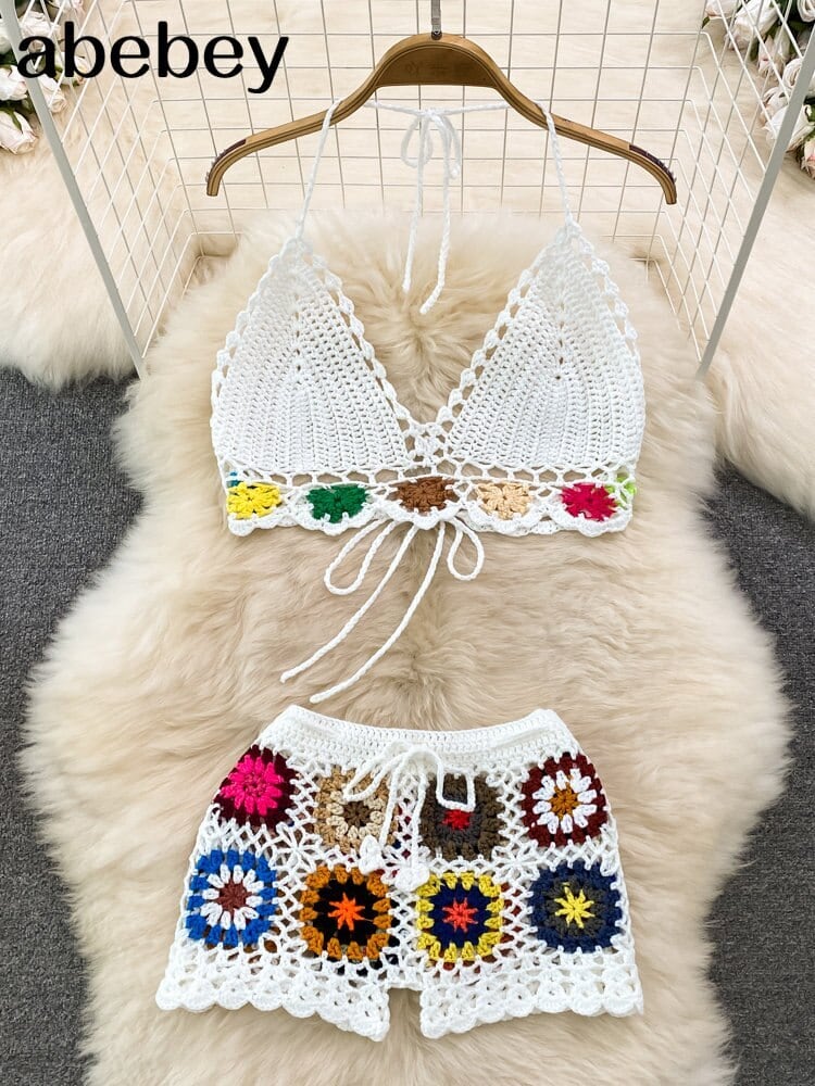 海辺の休日のスーツの女性の夏の摩耗のレトロなかぎ針編み中空ニット サスペンダー トップ + ショーツ 2 点セット サマー 夏物 ブルマー Abe50868770637