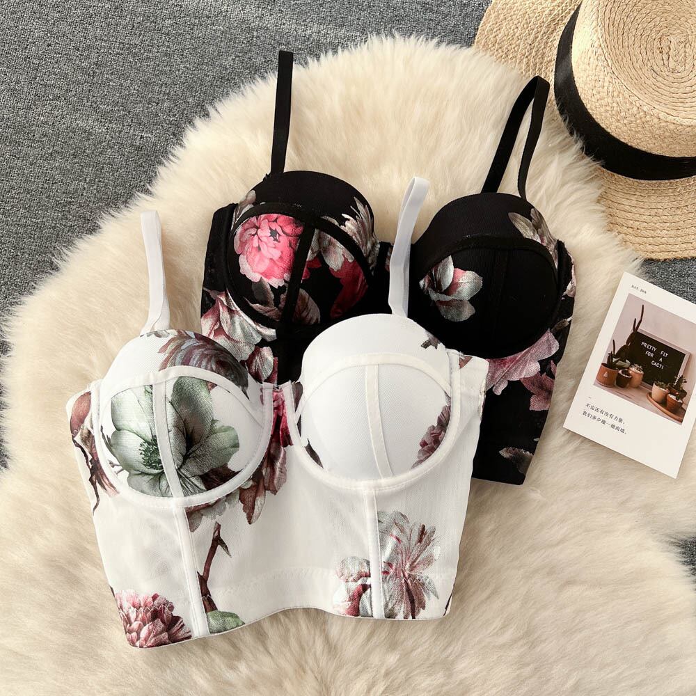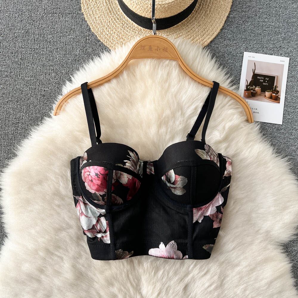 女性のブラジャープッシュアップビスチェトップス夏花柄パッド入りコルセットクロップトップススパゲッティストラップキャミソール下着 サマー 夏物 Abe70474765657
