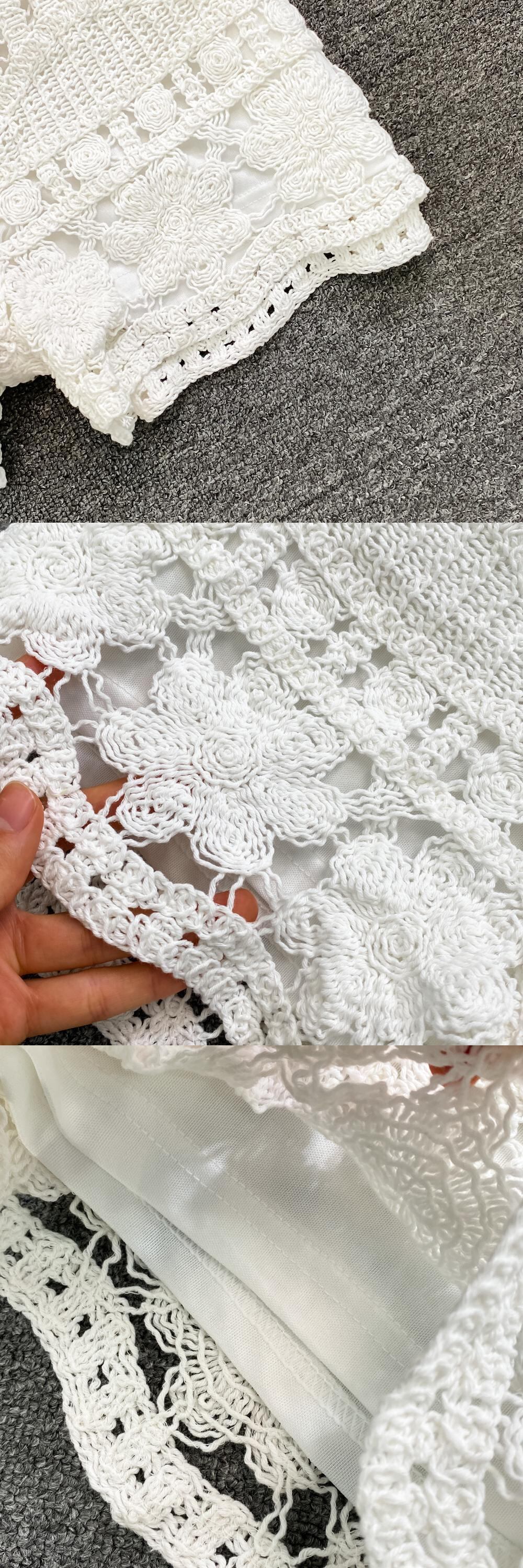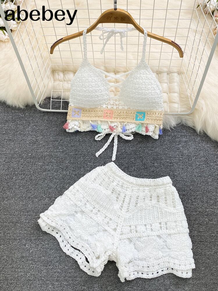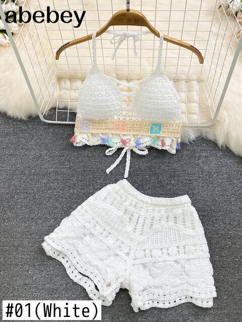 海辺の休日のスーツの女性の夏の摩耗のレトロなかぎ針編み中空ニット サスペンダー トップ + ショーツ 2 点セット サマー 夏物 ブルマー Abe668960737