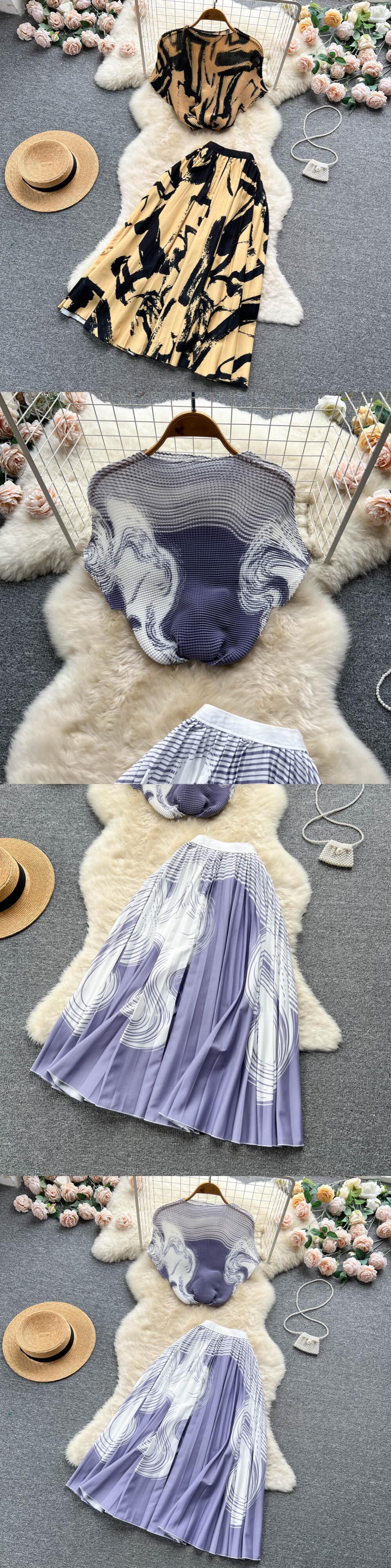 ボヘミアンバケーションビーチ 2 個セット女性花柄プリント半袖トップスとウエストプリーツロングスカートスーツ春夏 ショート ハーフスリーブ スプリング 春物 サマー 夏物 Abe80807549271