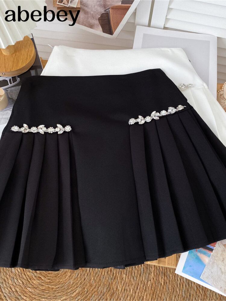 汎用性の高い無地スカートダイヤ飾りハイウエストショートAラインスカートプリーツスカート春秋 ハイウェスト スプリング 春物 オータム 秋物 ソリッドカラー Abe80792326158