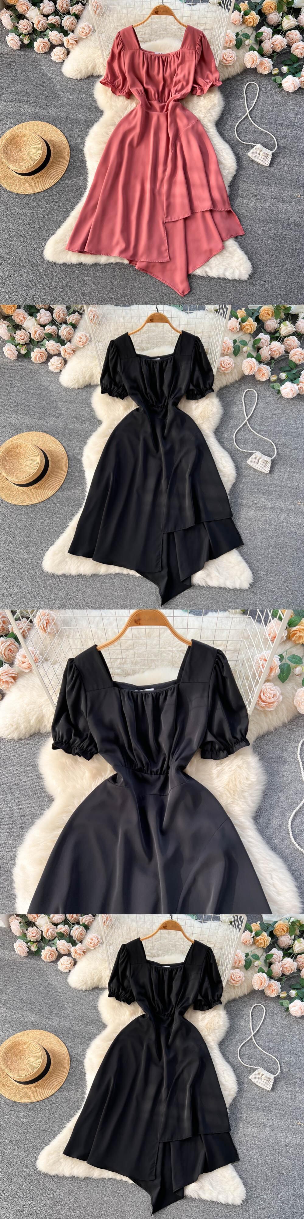 Fench スタイルの女性のドレスソリッド気質パフスリーブ Vestidos サッシ不規則なスプリットフリルドレス ラッフル ソリッドカラー Abe98797887058