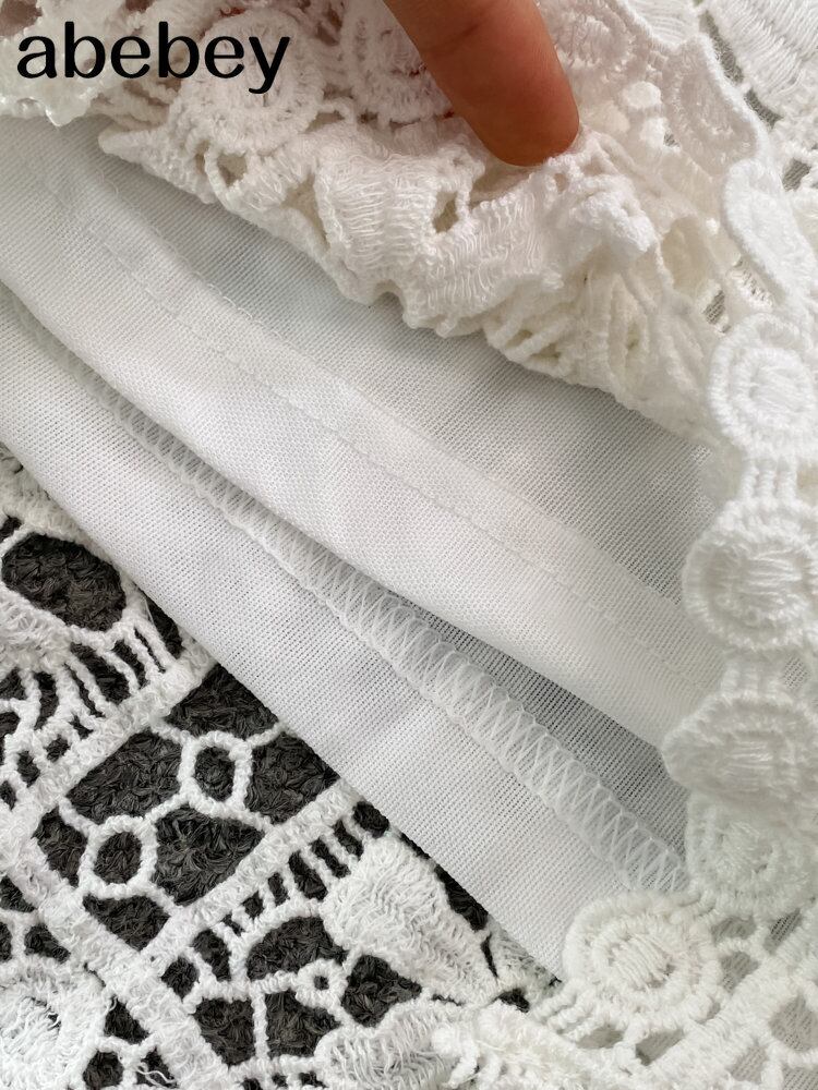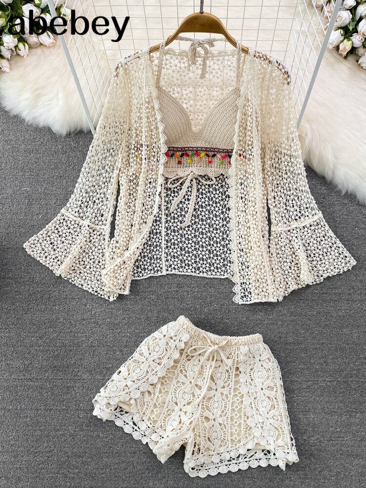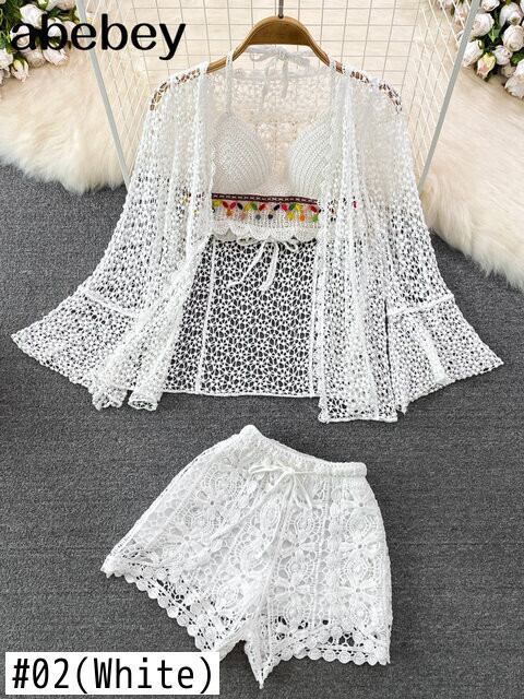 女性の夏のビーチスタイルかぎ針編み中空アウト 3 点セット太陽プルーフトップス + エスニックスパゲッティストラップベスト + ショーツ休暇スーツ サマー 夏物 ブルマー Abe37585888798