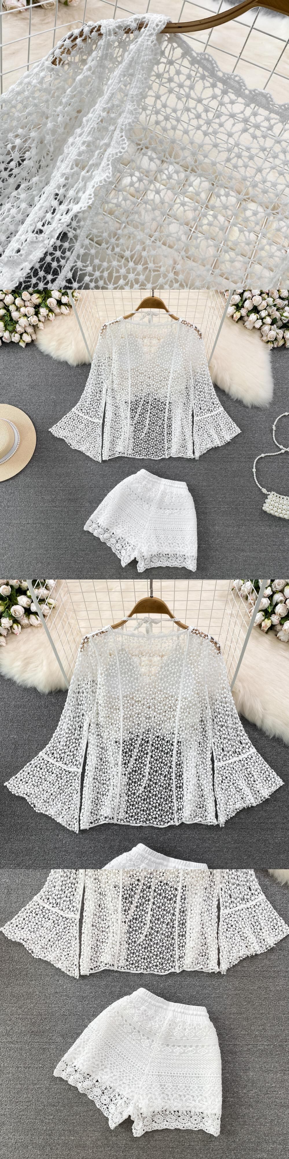 女性の夏のビーチスタイルかぎ針編み中空アウト 3 点セット太陽プルーフトップス + エスニックスパゲッティストラップベスト + ショーツ休暇スーツ サマー 夏物 ブルマー Abe56057807540