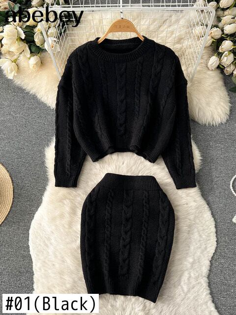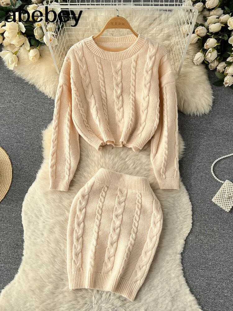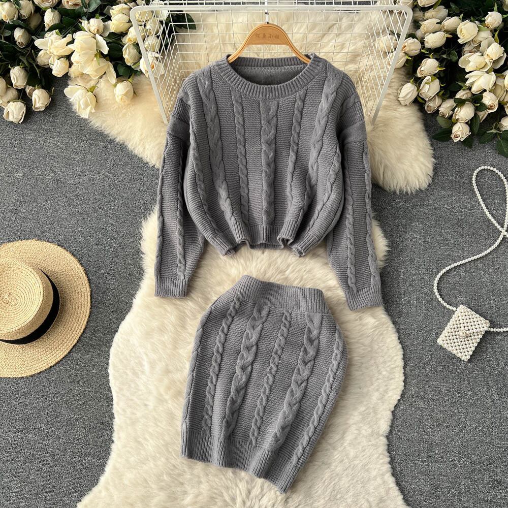 秋冬クルーネック長袖ツイストニットセットツーピースセット女性トップとスカート衣装 ロング オータム 秋物 ウィンター 冬物 Abe90815945501