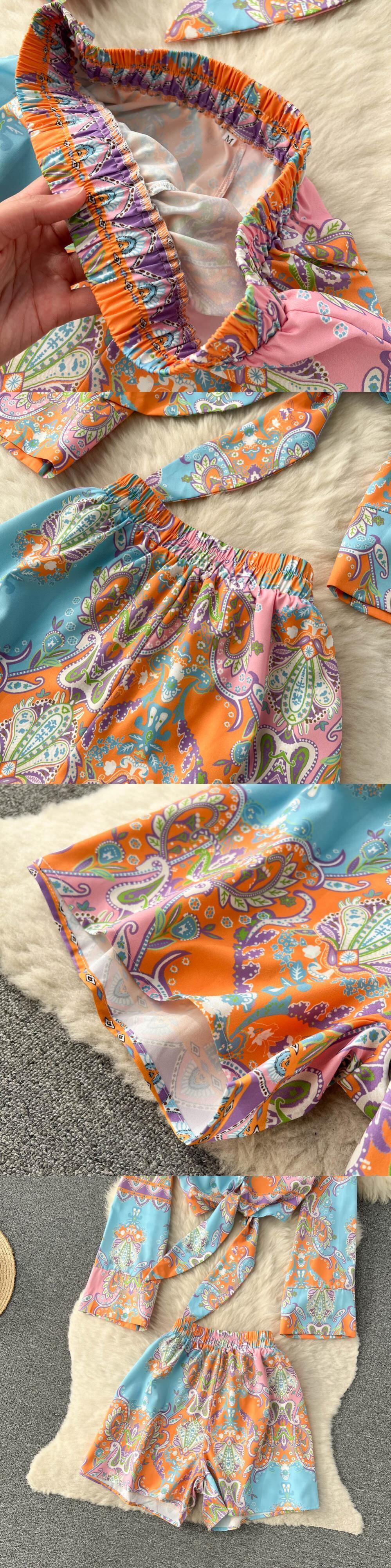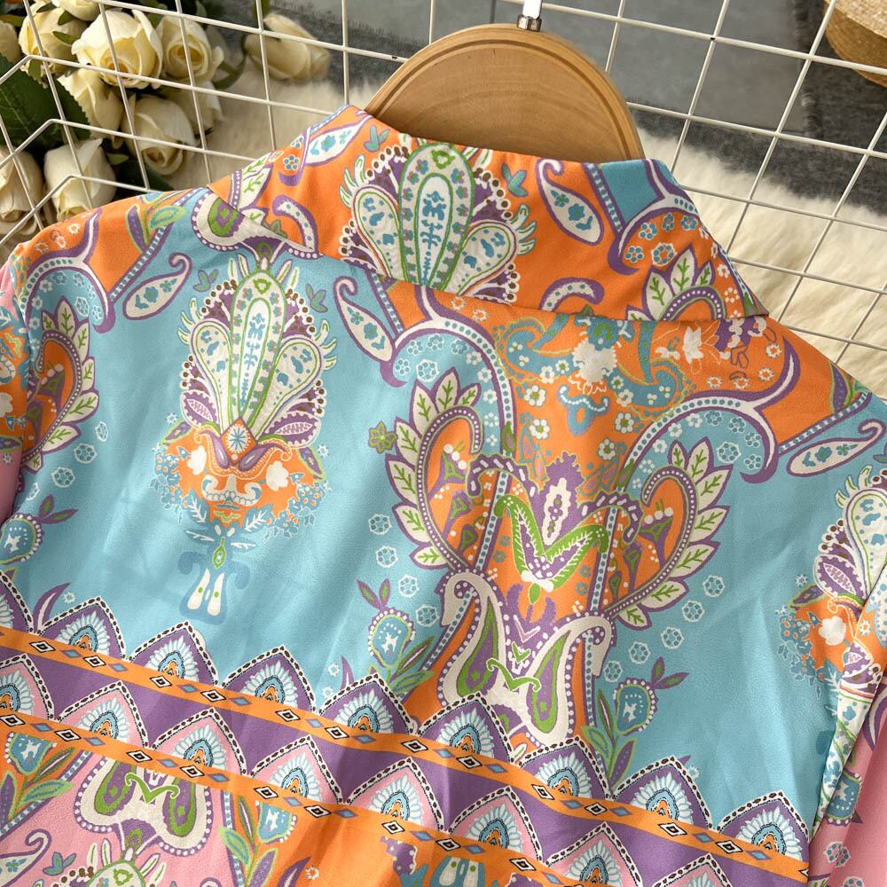 夏休みプリント 2 点セット女性ラペルネック長袖ブラウス + ルーズショートセットペイズリービーチスーツ ロング サマー 夏物 Abe10677784497
