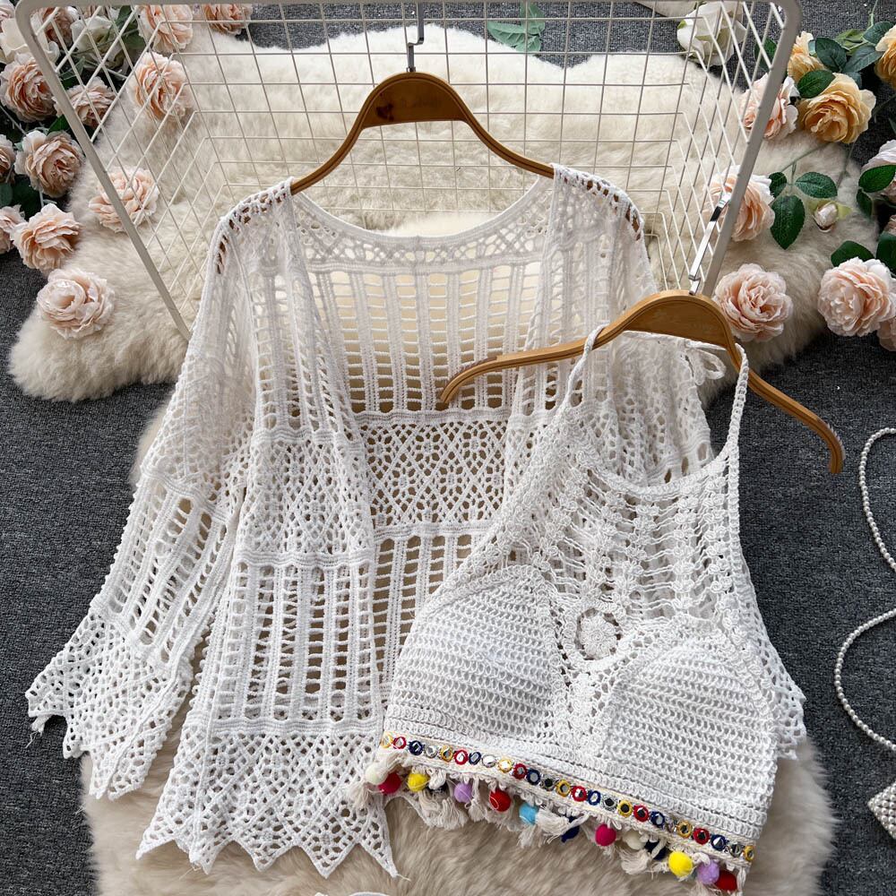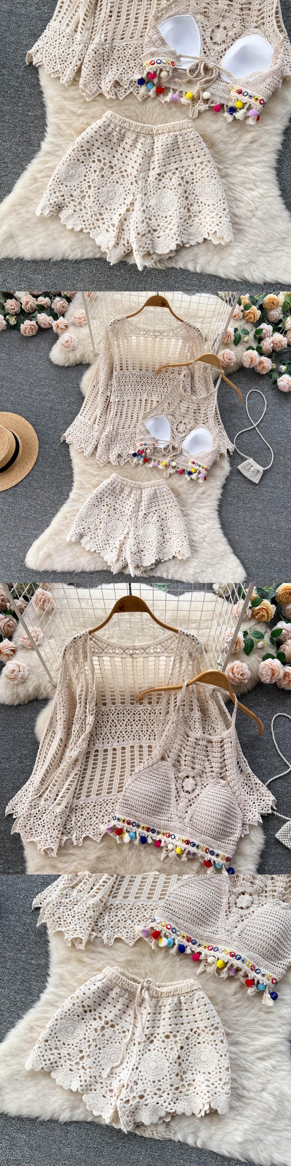 女性の夏のセクシーな自由奔放に生きるレース 3 点セット Tel クロップトップショーツ中空カーディガンホリデービーチサンウェアマッチングセット サマー 夏物 ブルマー Abe69875924444
