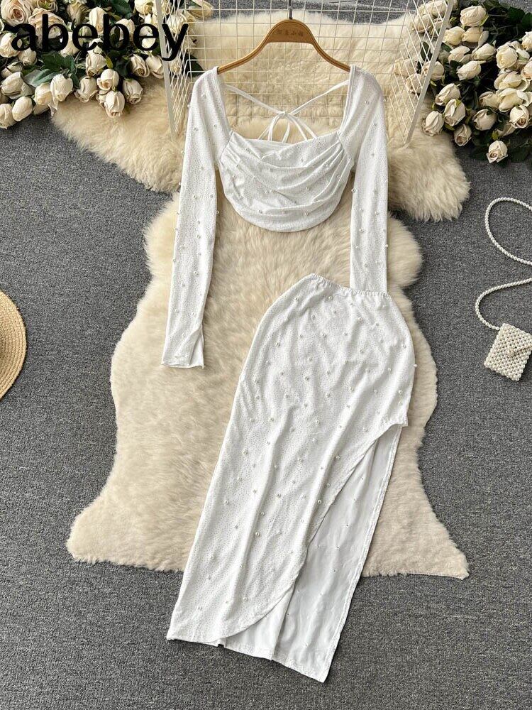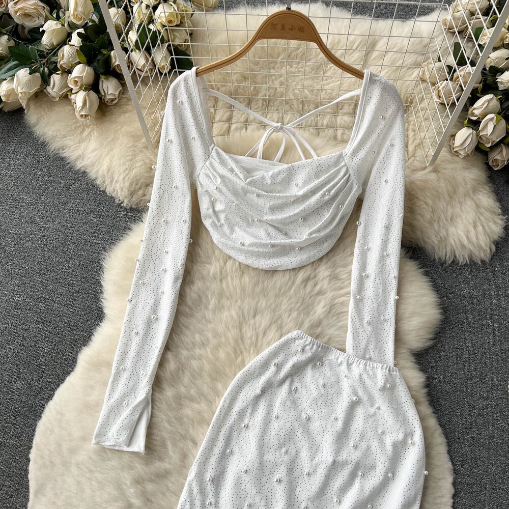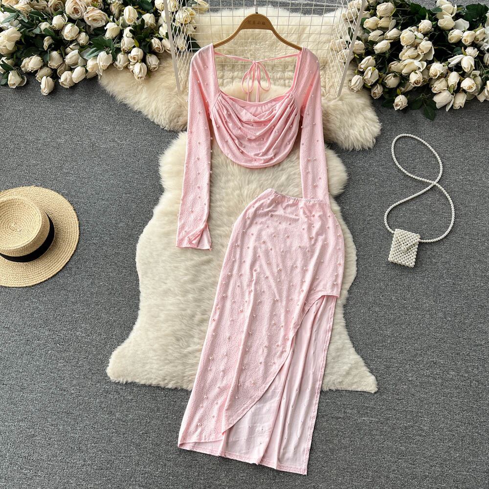 休暇ビーチセクシースーツ夏長袖パールトップ + ミディスカートセットパーティー OL ツーピースセット ロング サマー 夏物 真珠 Abe39547148011