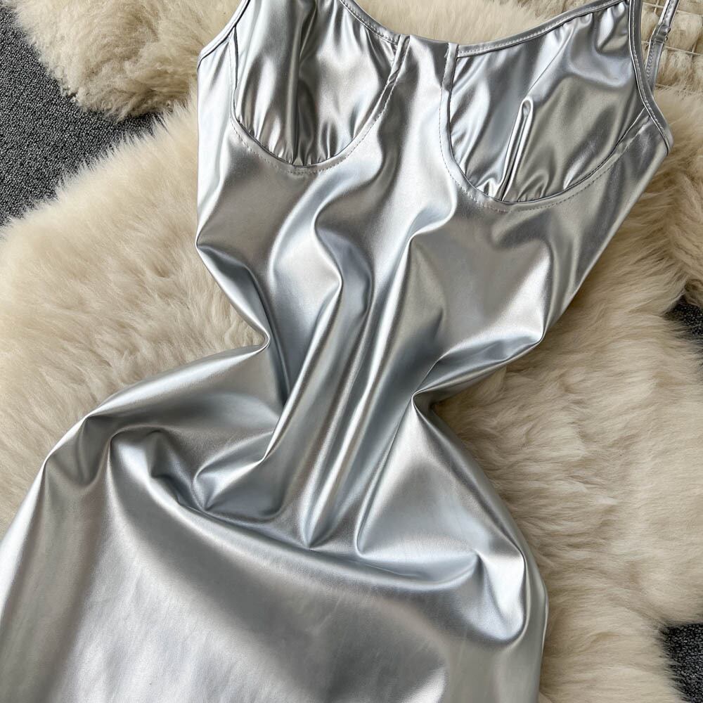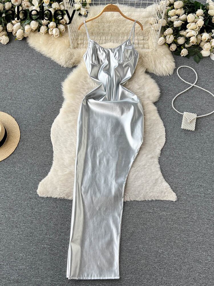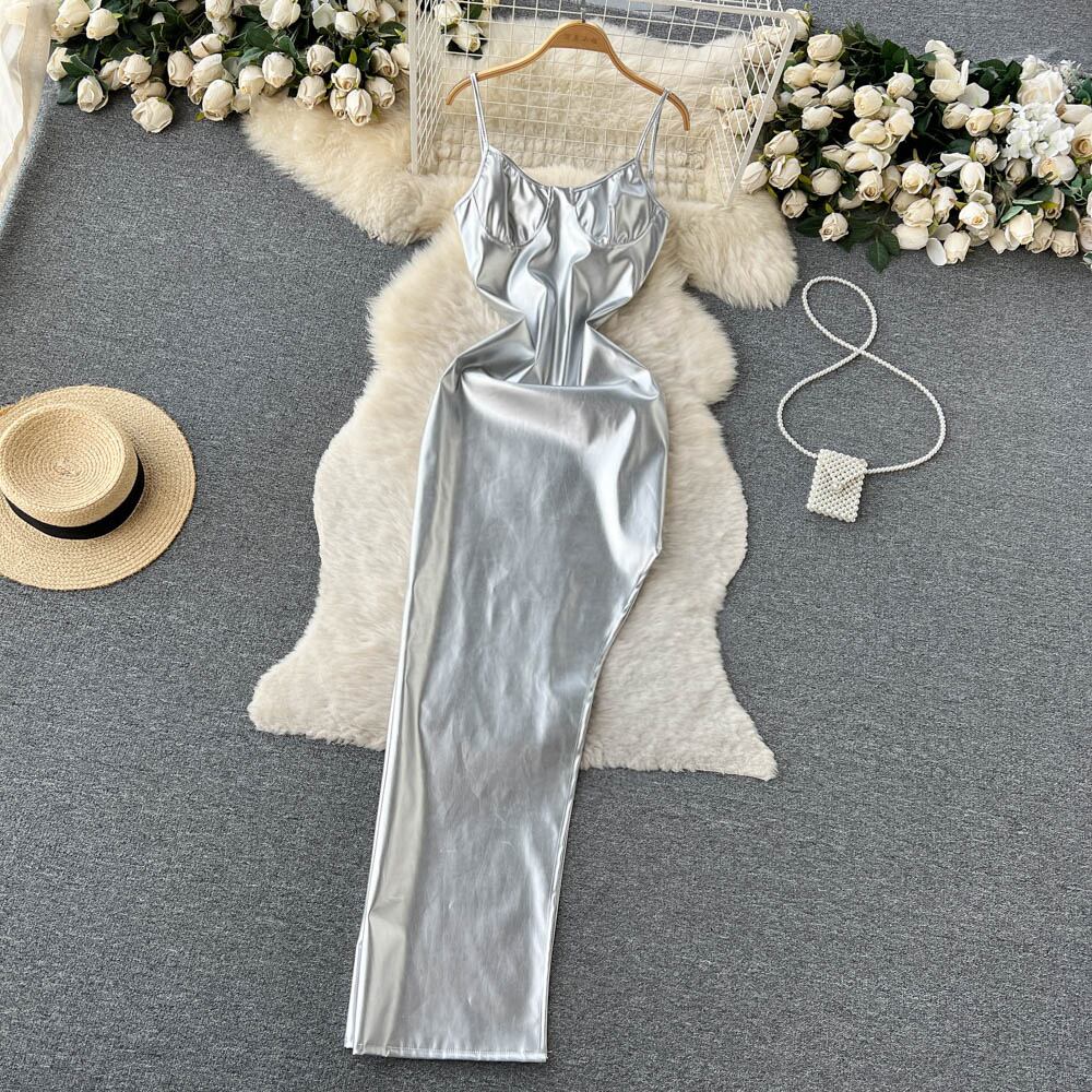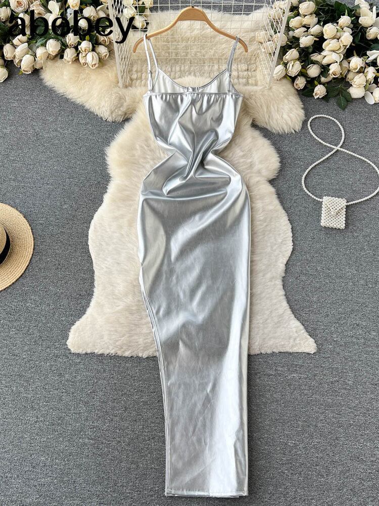ミディ PU ドレススプリット調節可能なストラップシャーリングカウルネック非対称ジッパーパーティードレスセクシーな女性のドレス アジャスタブル Abe51566642104