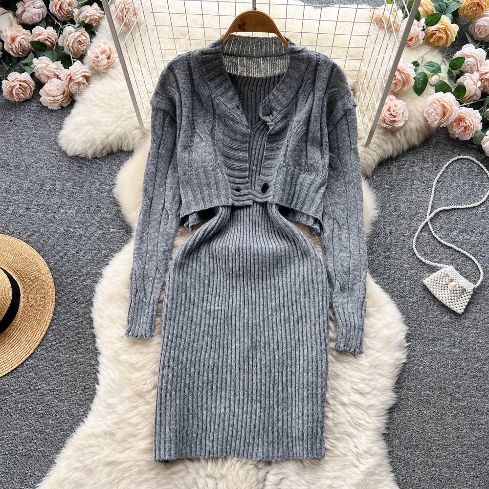ニット女性セットルーズロングスリーブカーディガンセーター + ソリッド弾性ドレスフレンチスタイルツーピースセット衣装 長袖 エラスティック 伸縮 ソリッドカラー Abe72787085197