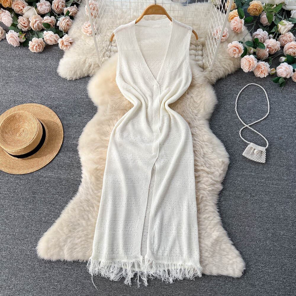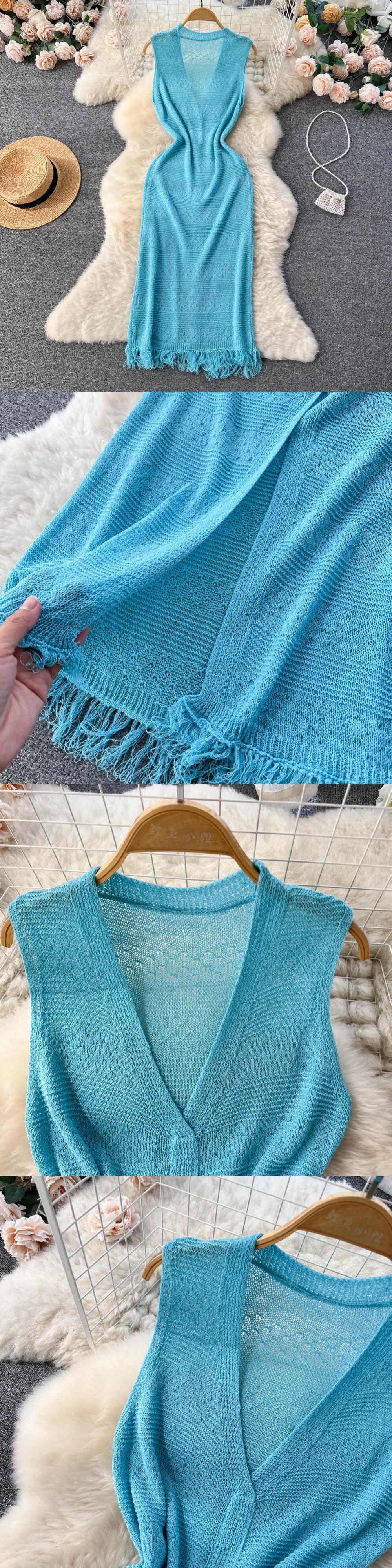 夏中空アウト休暇ニットロングドレス女性 V ネックノースリーブスリムシックなサンドレスホリデーソリッドビーチドレス サマー 夏物 Vネック ソリッドカラー Abe54469569984