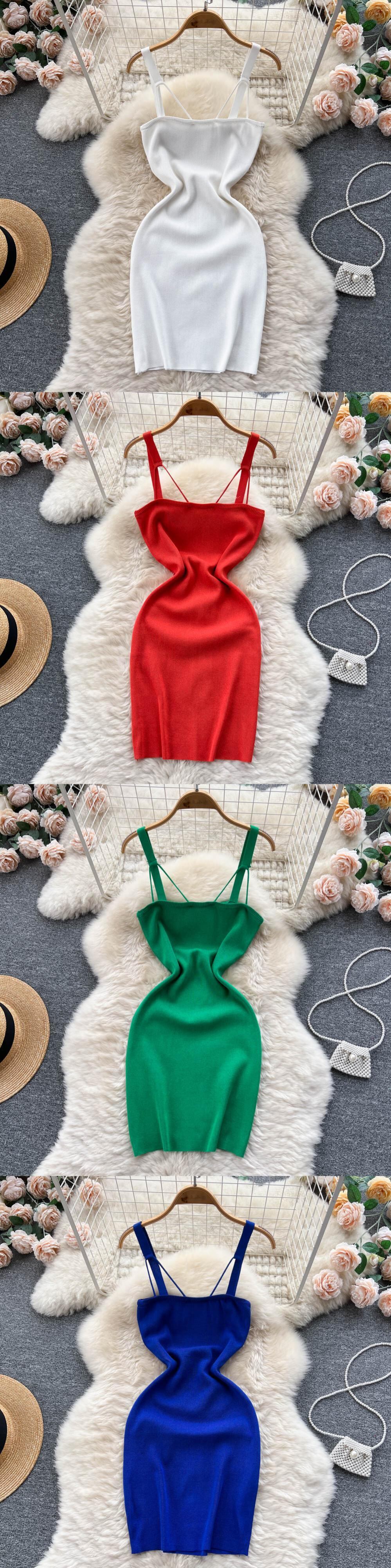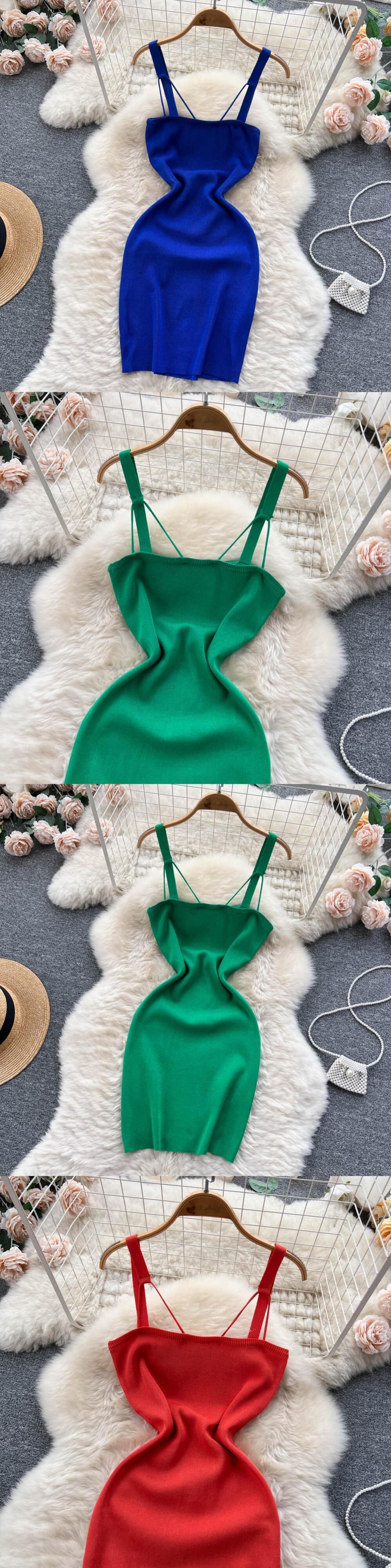 女性ニットドレス夏ストラップ弾性ウエスト背中の開いたサンドレスストリートセクシーなセーターミディドレス エラスティック 伸縮 サマー 夏物 Abe44033134063
