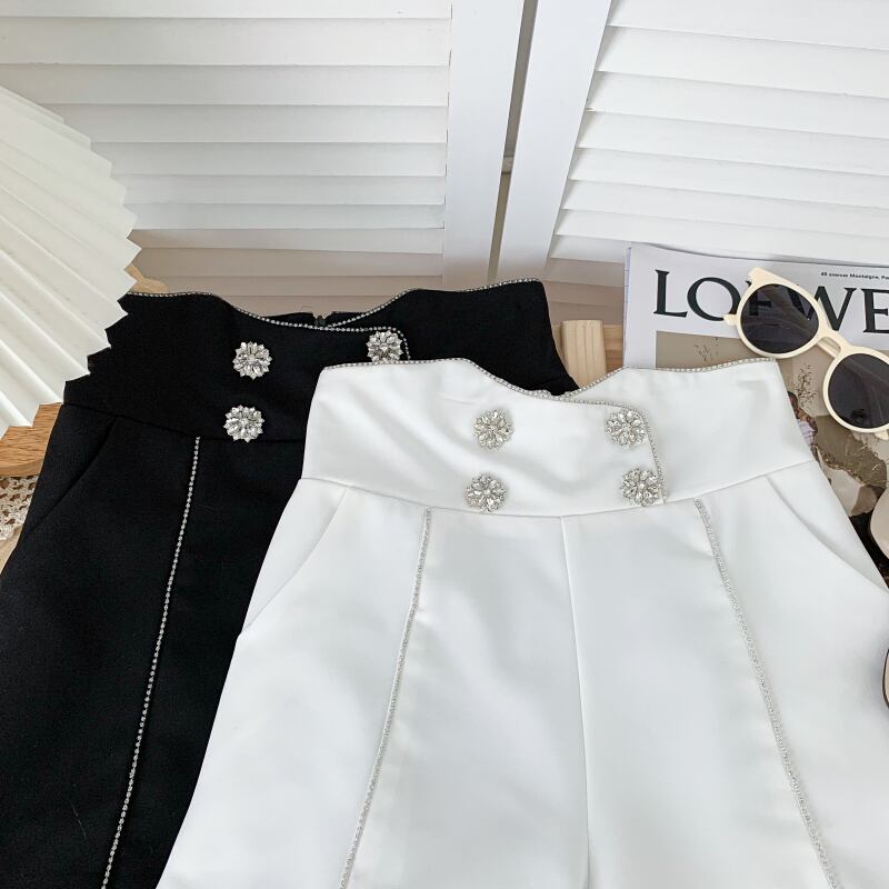 気質万能無地ショーツダイヤ縁取りダブルブレストハイウエストプリーツカジュアルワイドレッグショーツ夏 ハイウェスト サマー 夏物 ブルマー ワイドパンツ ソリッドカラー Abe4501424680