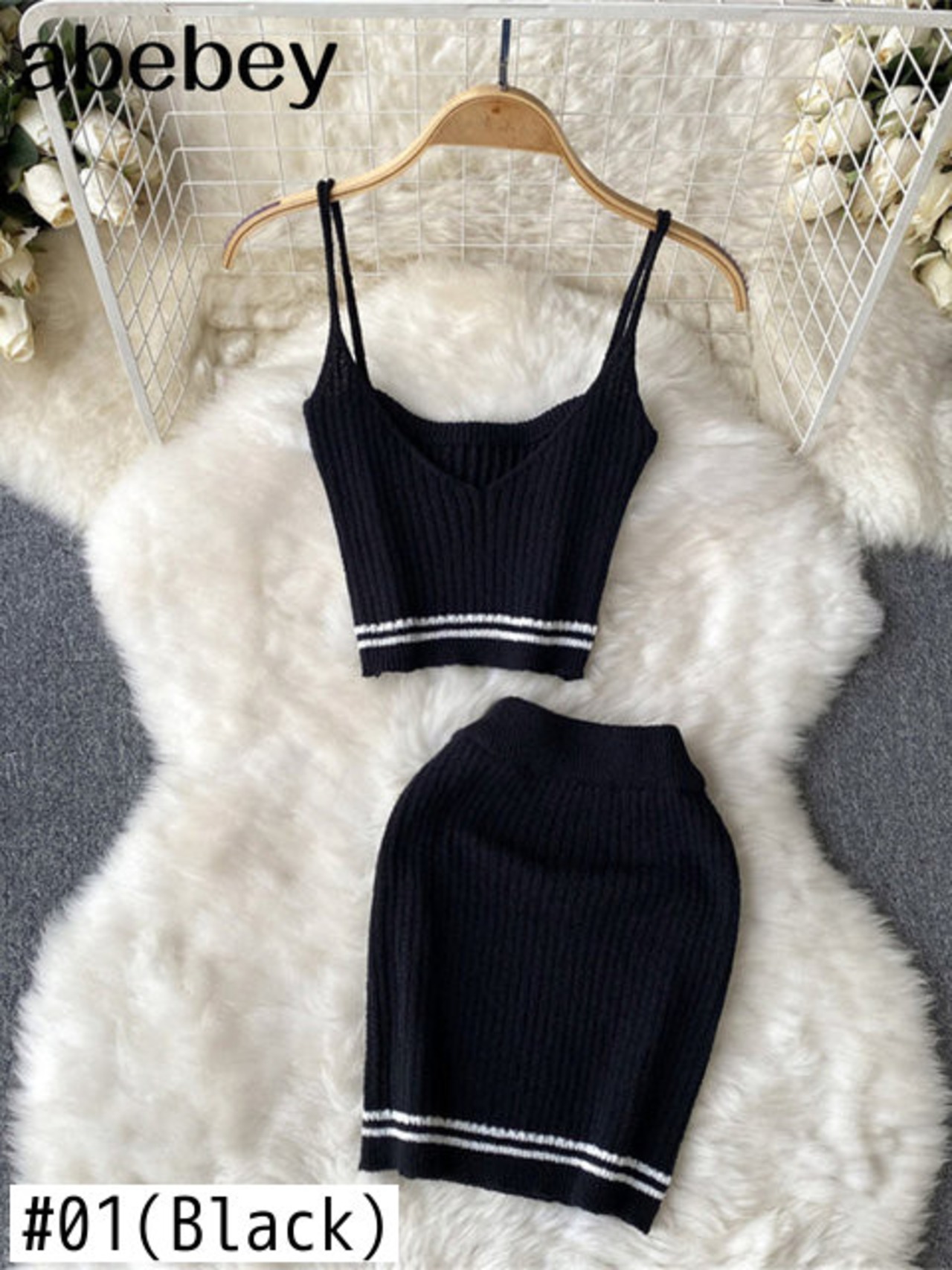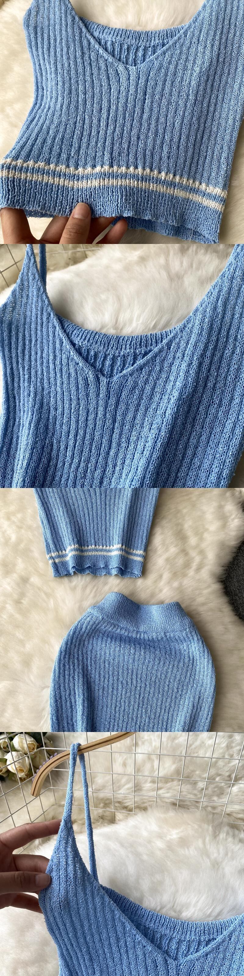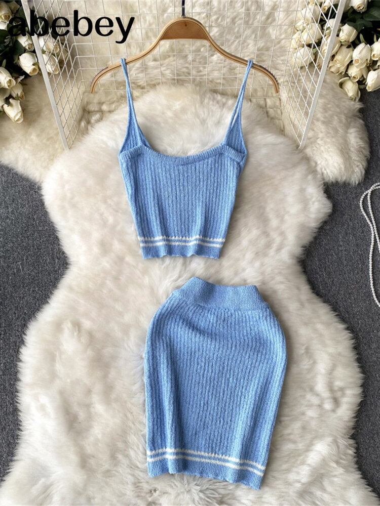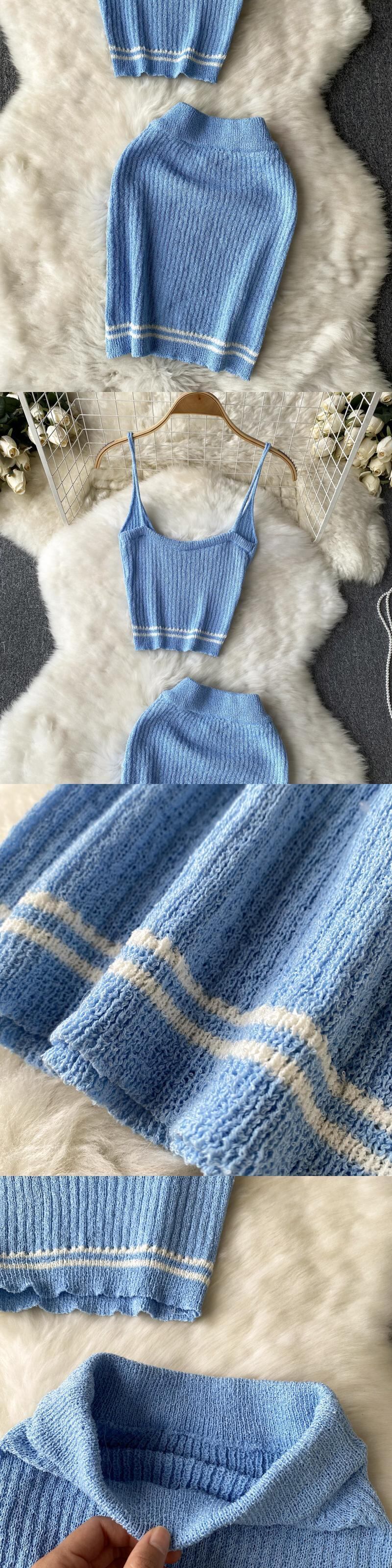 ツーピース ニット セット ストラップ キャミソール バケーション 中空 ミニ スカート ビーチ スタイル サマー スーツ 夏物 Abe77853181573