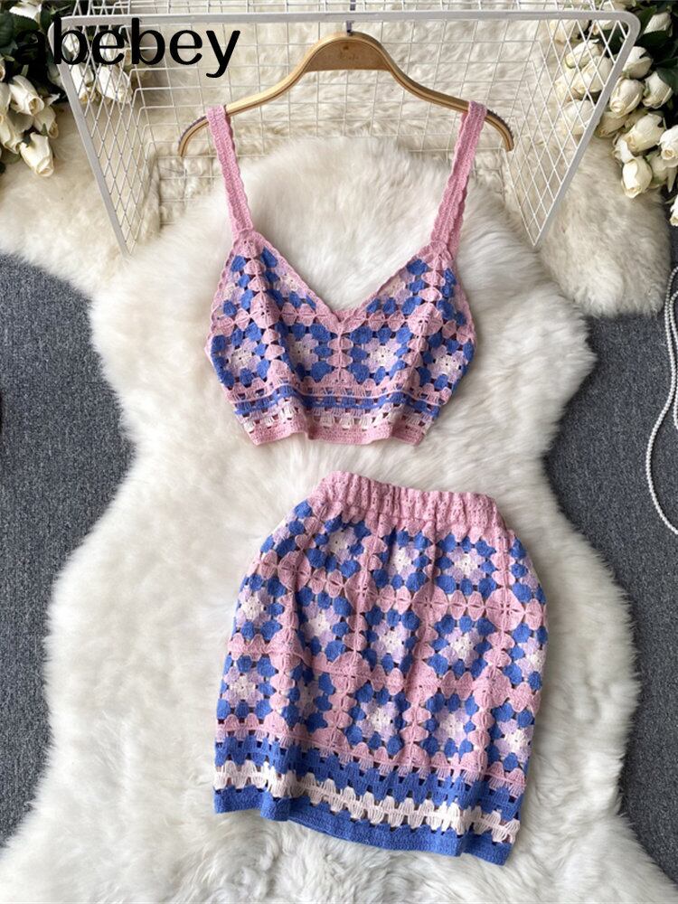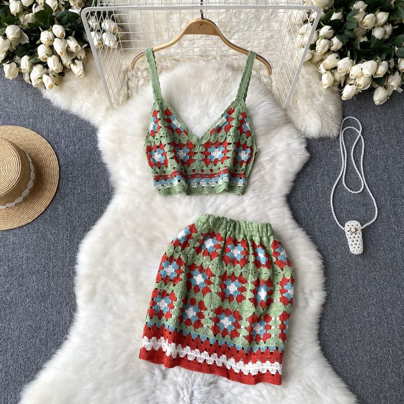 海辺の休日のスーツの女性の夏の摩耗のレトロなかぎ針編み中空ニット サスペンダー トップ + ショーツ 2 点セット サマー 夏物 ブルマー Abe21977600163