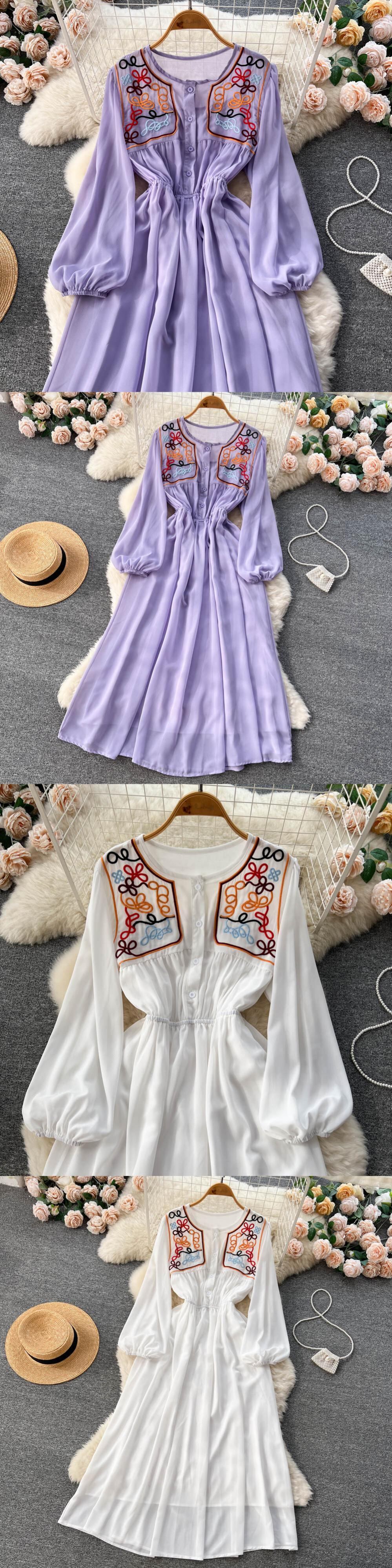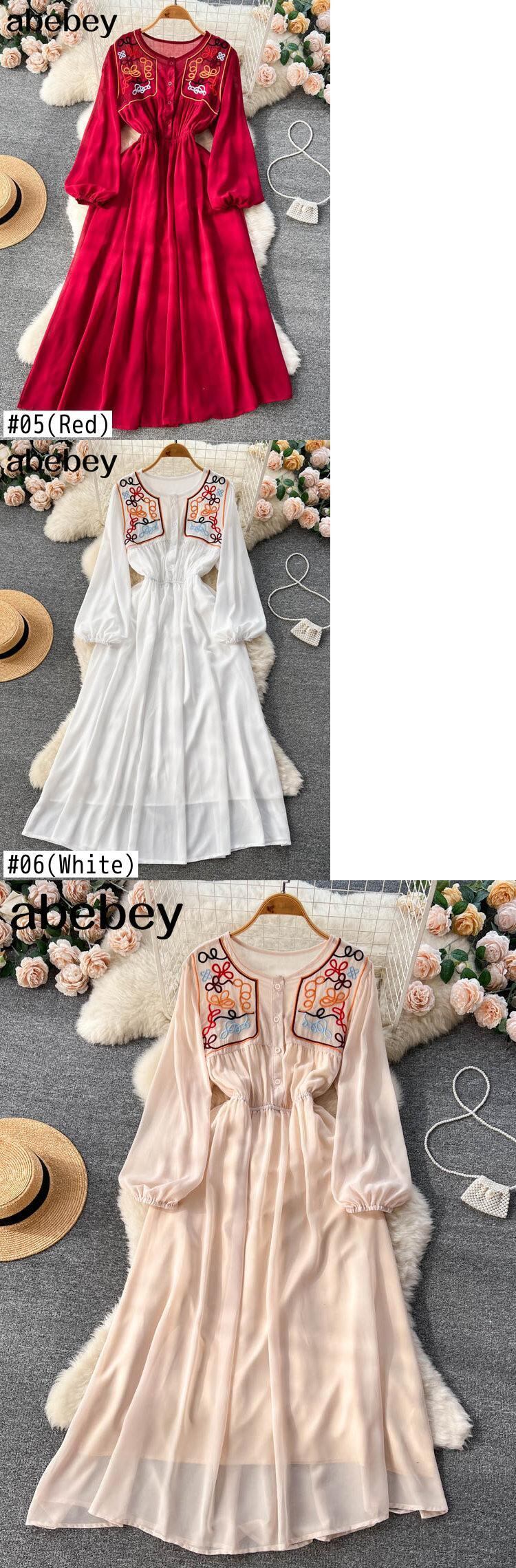 夏の女 ハイウェスト ロング レース 長袖 プリーツ サマー 夏物 Oネック Aライン レースアップ Abe64955882718